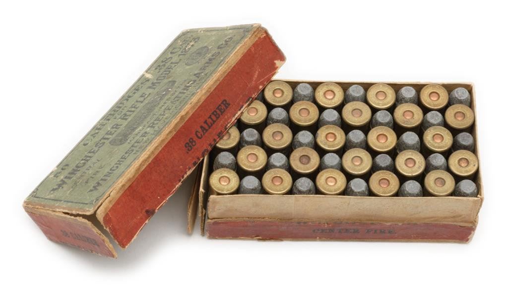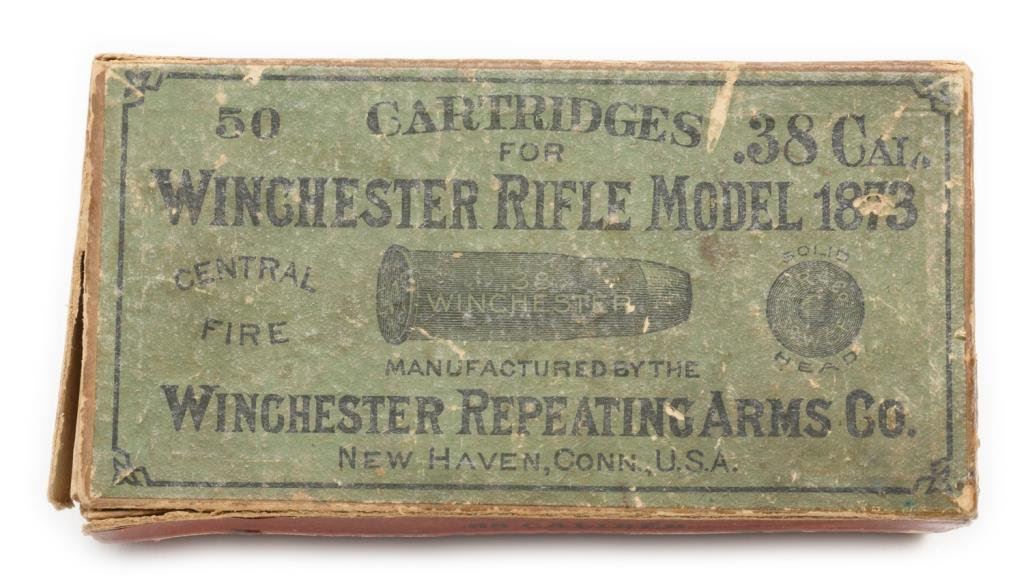 Original cartridge picture box of 50 .38 caliber cartridges for the Winchester Model 1873 rifle, green lid label with red side labels; full and in overall good condition with separation of several edges of the box that should be carefully repaired. Est.: $150-$300.