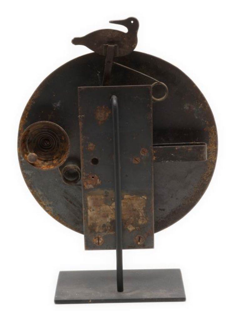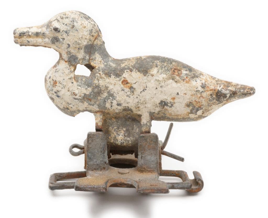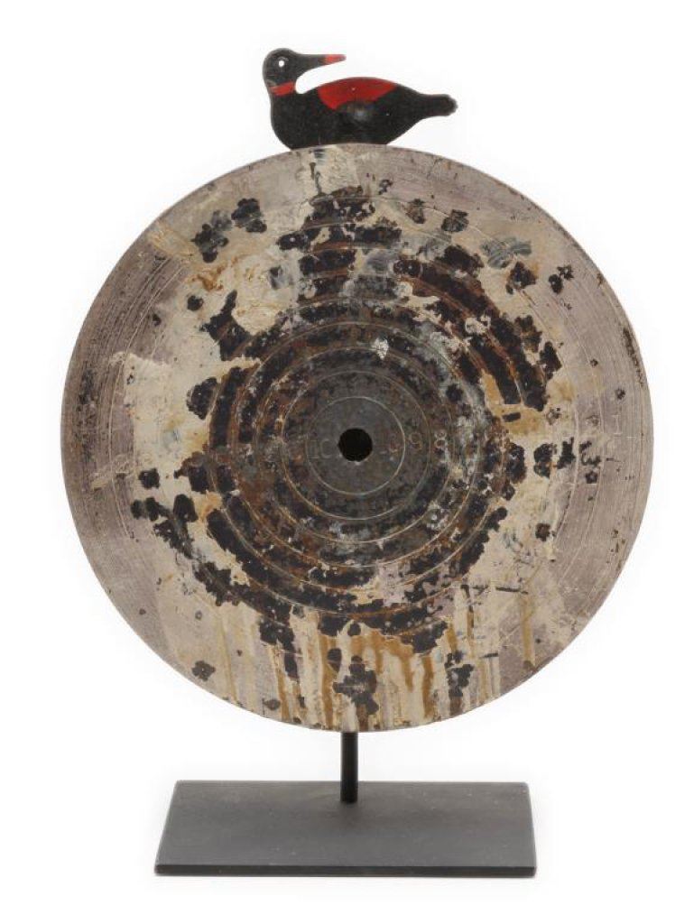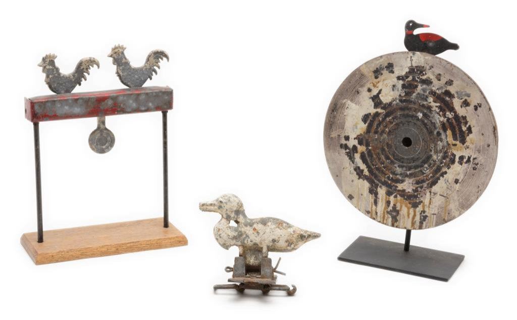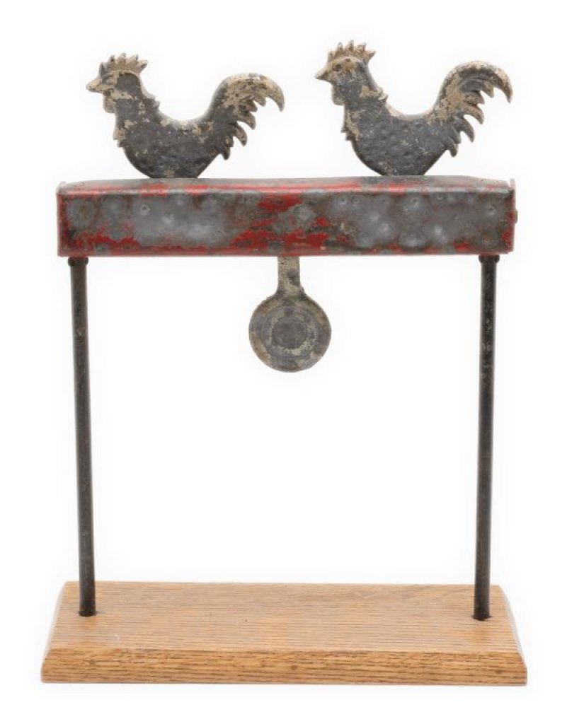 Lot of 3 antique iron shooting targets including a 12” diameter graduated target with bird on the top and bell that rings when the target is hit; considerable original paint remaining and on an iron stand; also an iron target on wood stand with two chickens and a disc, approx. 10” wide and 13” in height with some original paint remaining; lastly, a cast iron duck target with some original paint remaining, approx. 8” wide x 6” in height. A neat collector’s lot of old time targets. Est.: $150-$250.