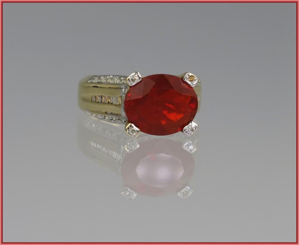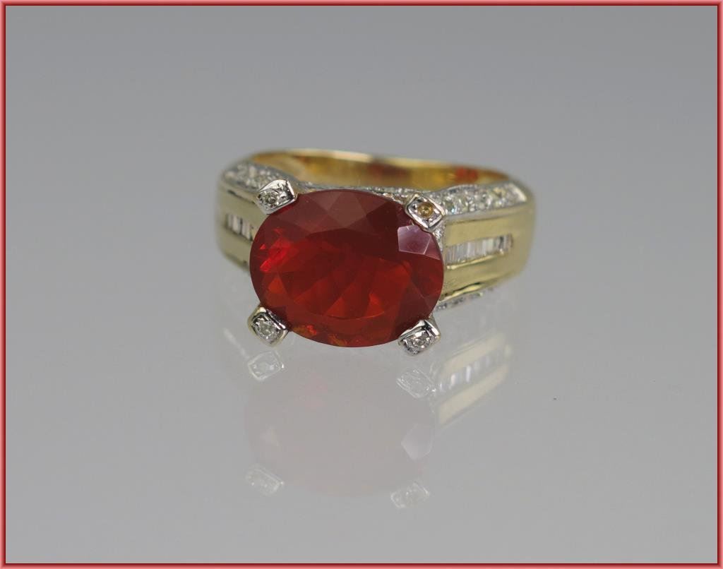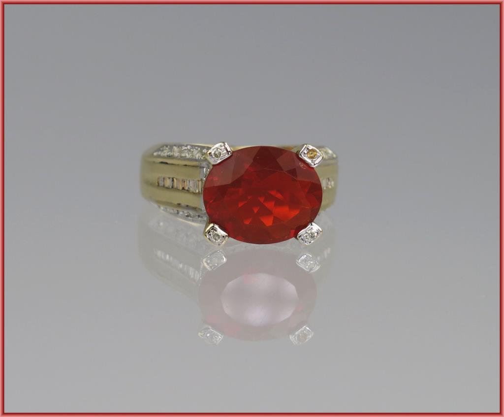 Irresistible Fire Opal and Diamond Fashion Ring in elegant setting featuring an approx. 4.00 carat oval fire opal with 72 round and baguette cut Diamonds weighing approx. 1.00 carats set in 6.00 grams of 14 karat yellow gold. Retail $1,400-$1,800 Estimate $700-$900
