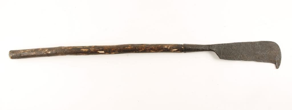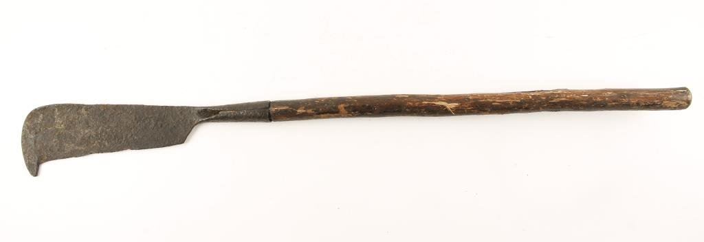 Ancient European Pole Arm head, primitive style used as a farm implement and peasant weapon ca 1400-1700 A.D.; measures approximately 41” overall. Est.: $200-$400.