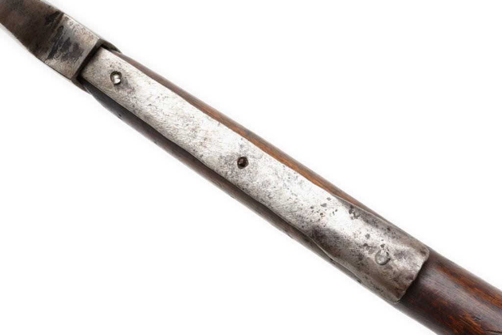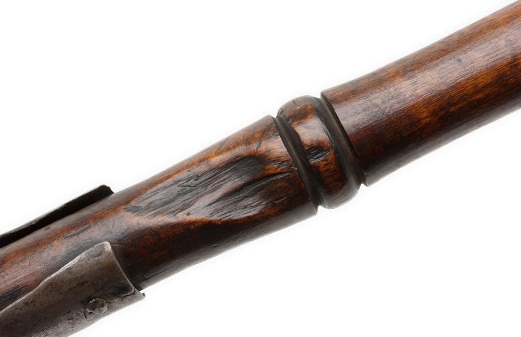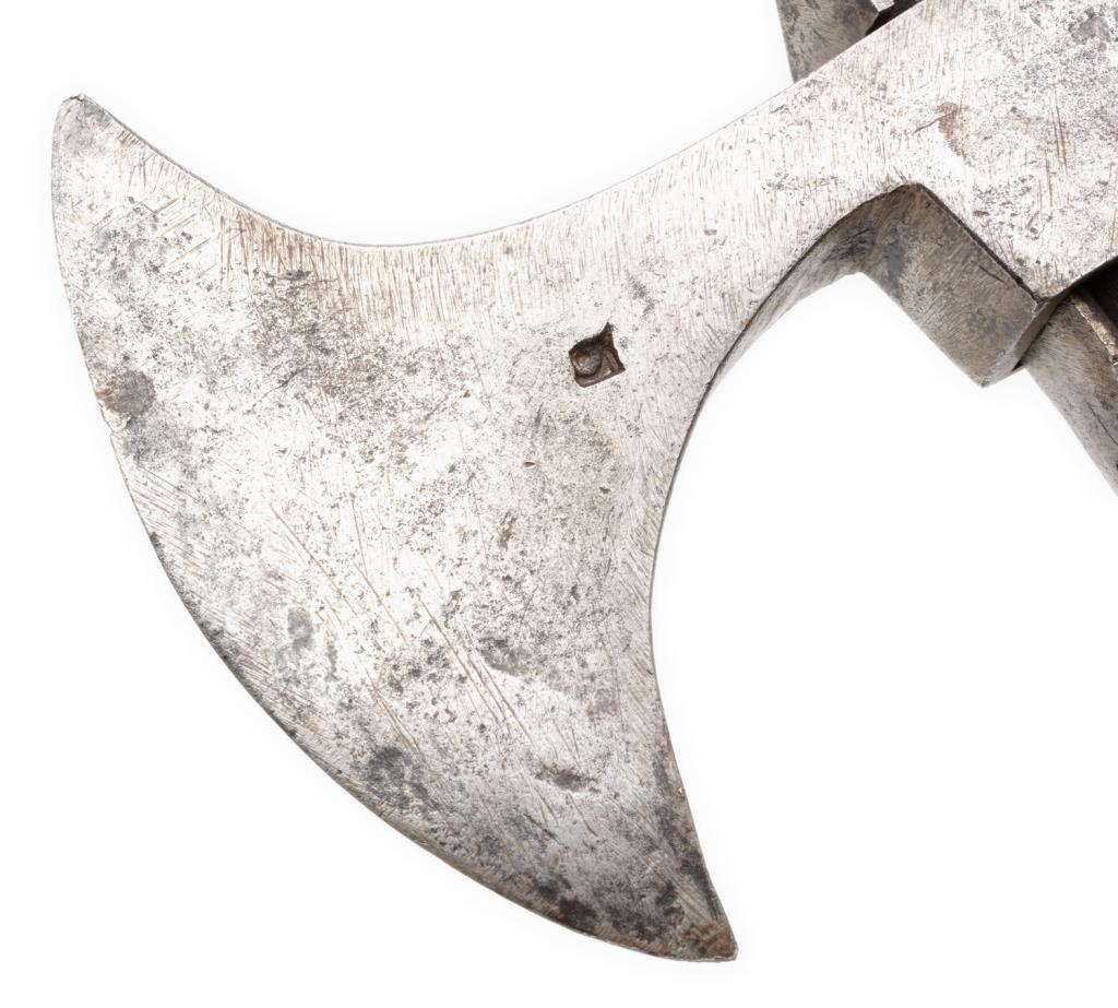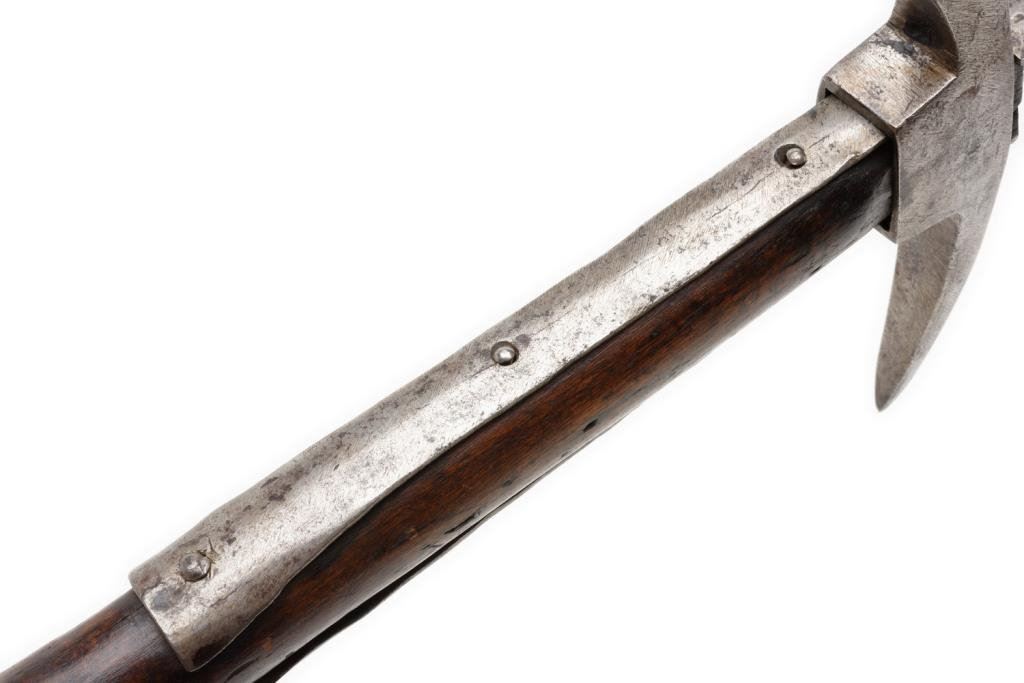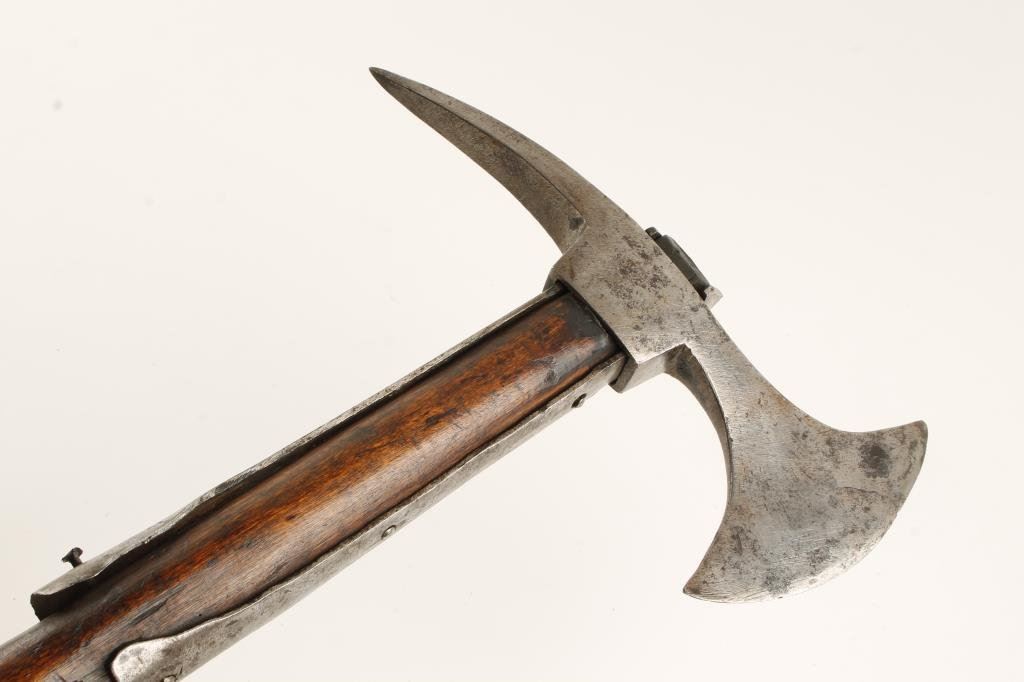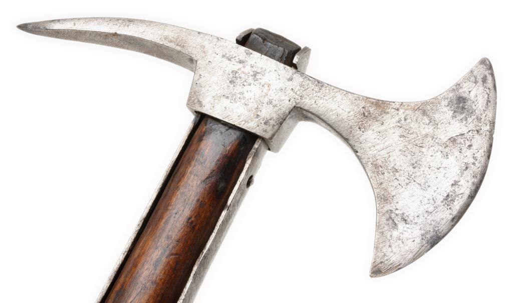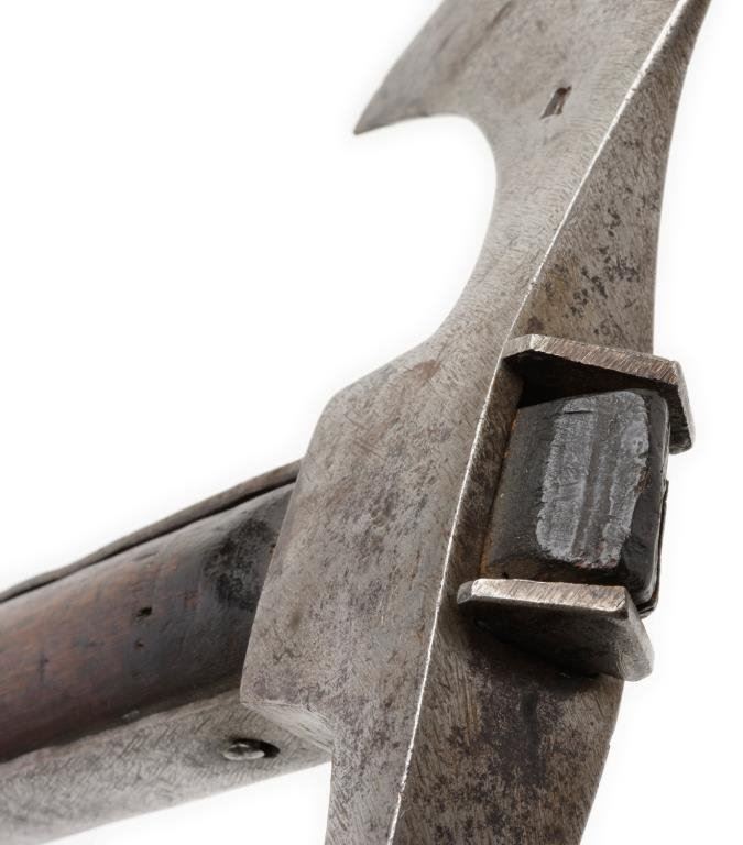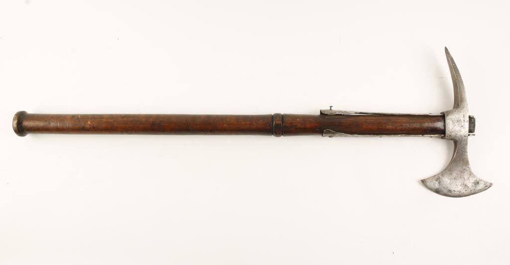 Antique French boarding axe; appears to be ca late 1700’s early 1800’s; iron head is approximately 11” overall with a 5.5” axe head on one end and a pick shape on the other. The left side of the axe head shows a touch mark; the approximate 33” long handle appears old but likely not original to this head that also has two 11” securing iron tangs. Est.: $400-$600.