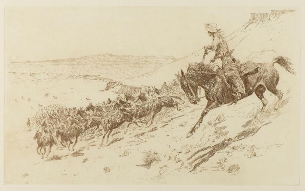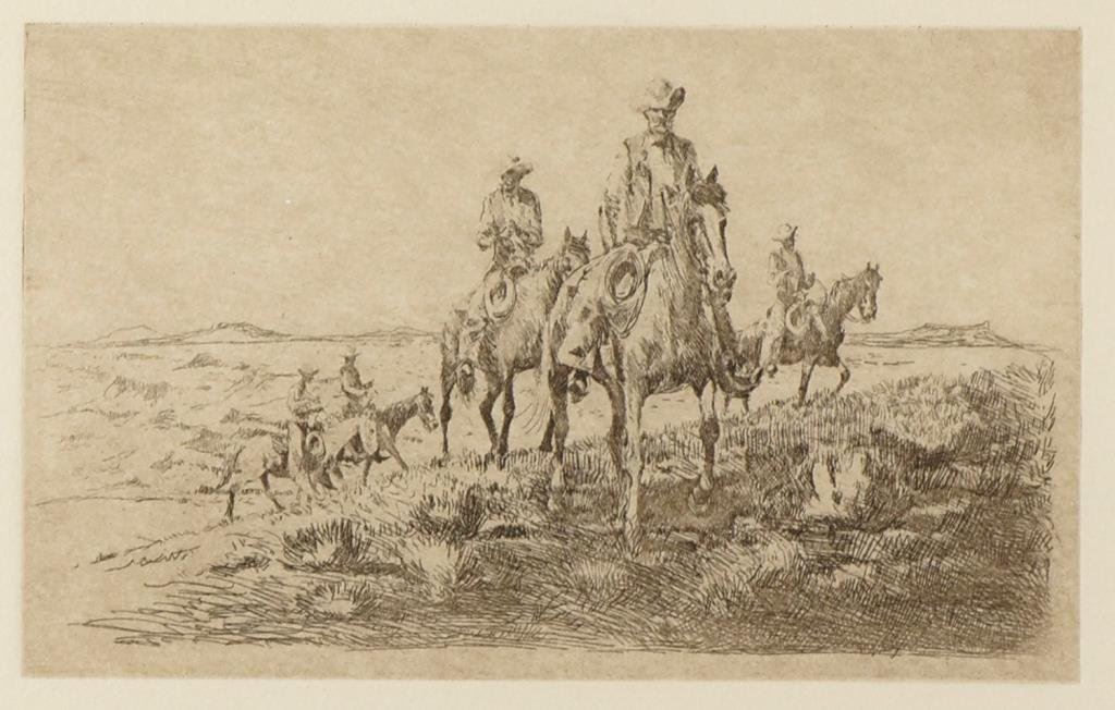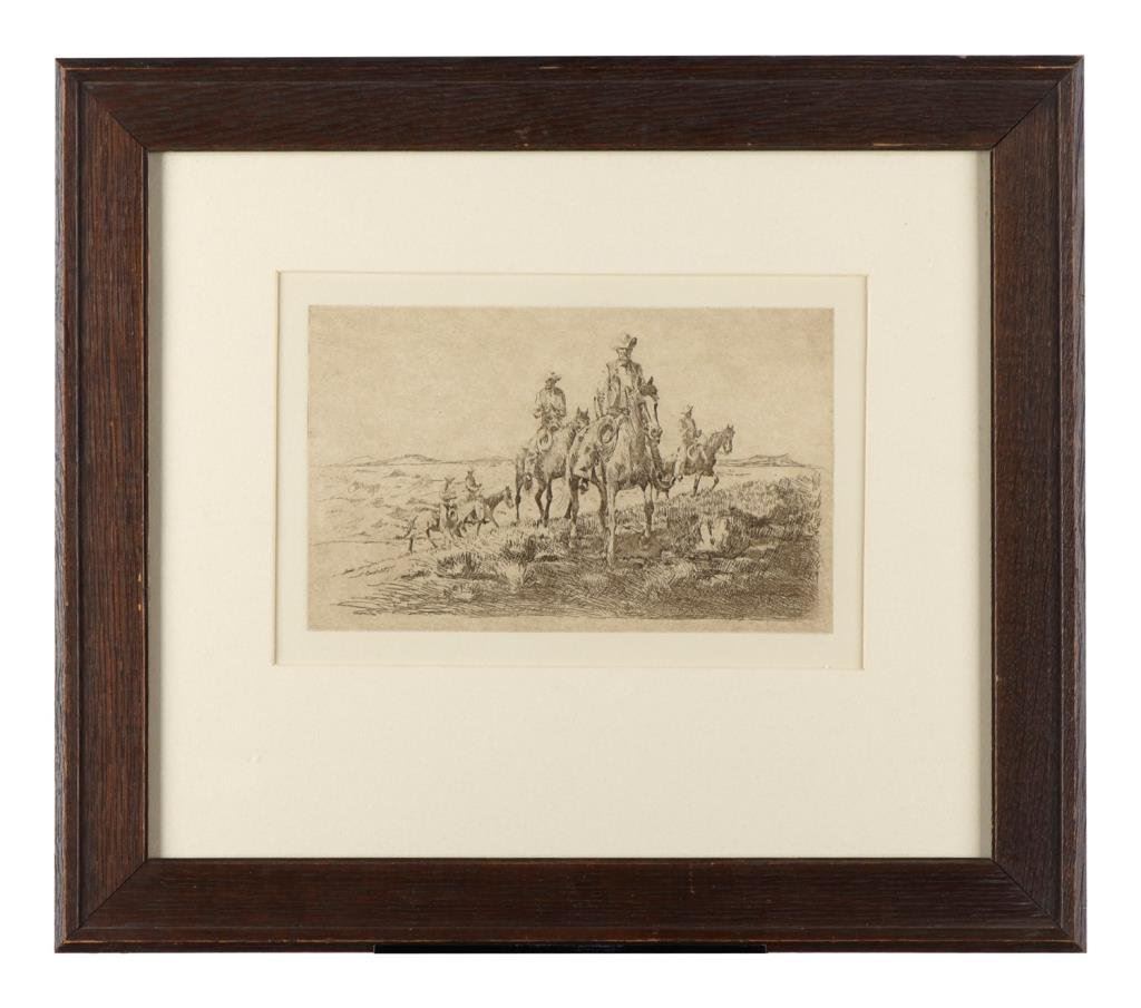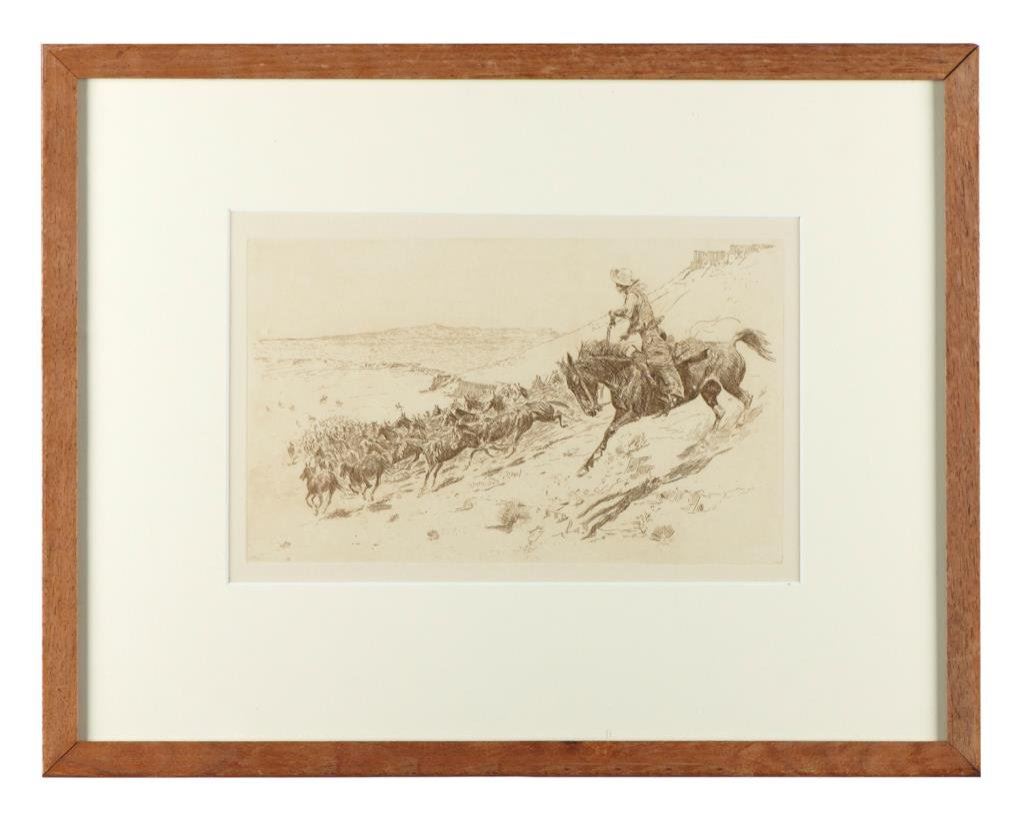 Two framed and matted Western etchings by noted artist, Edward Borein (1872-1945). First is of cowboy riders, approx. 13-1/2” x 15-1/2” overall (image size approx. 5” x 8”); second is of a cowboy outrider following a herd of horses, approx. 15” x 19” overall (image size approx. 6-1/2’ x 11”). Both in very good to fine condition. Est.: $200-$300.