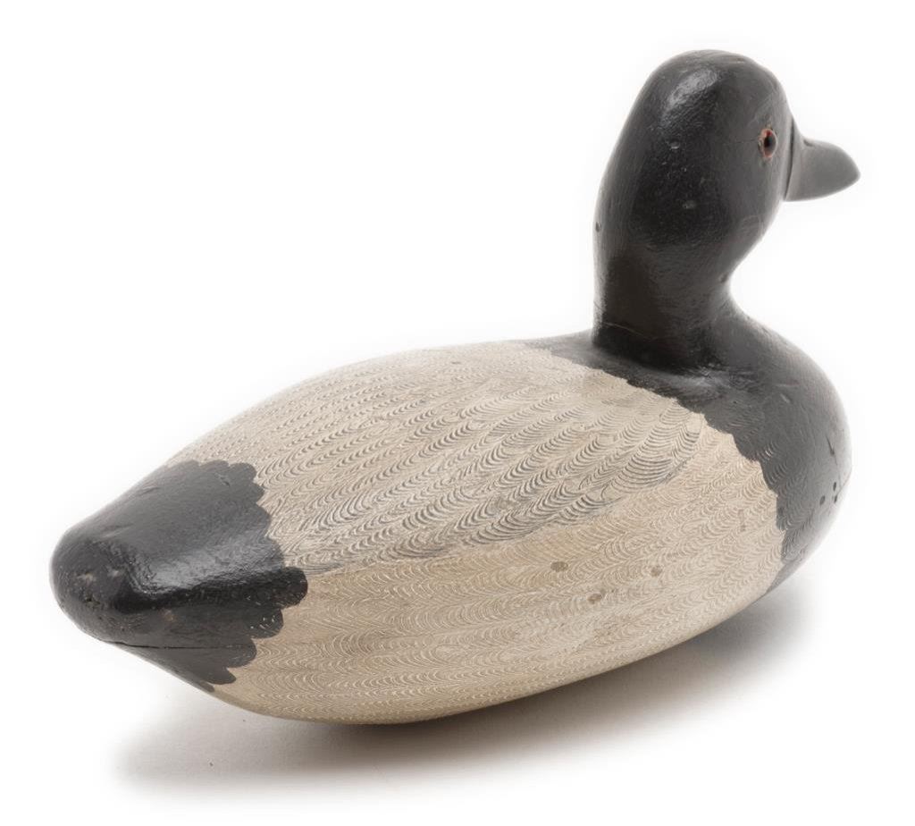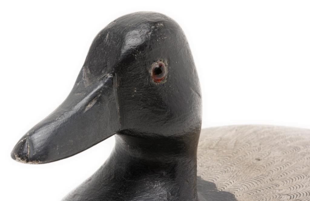Very nice old wooden carved and painted duck decoy with glass eyes, approx. 11” x 5” x 7”; black & white with the majority of original appearing paint; with tag “Bluebill, Ill River, c 1925”. Est.: $100-$150.