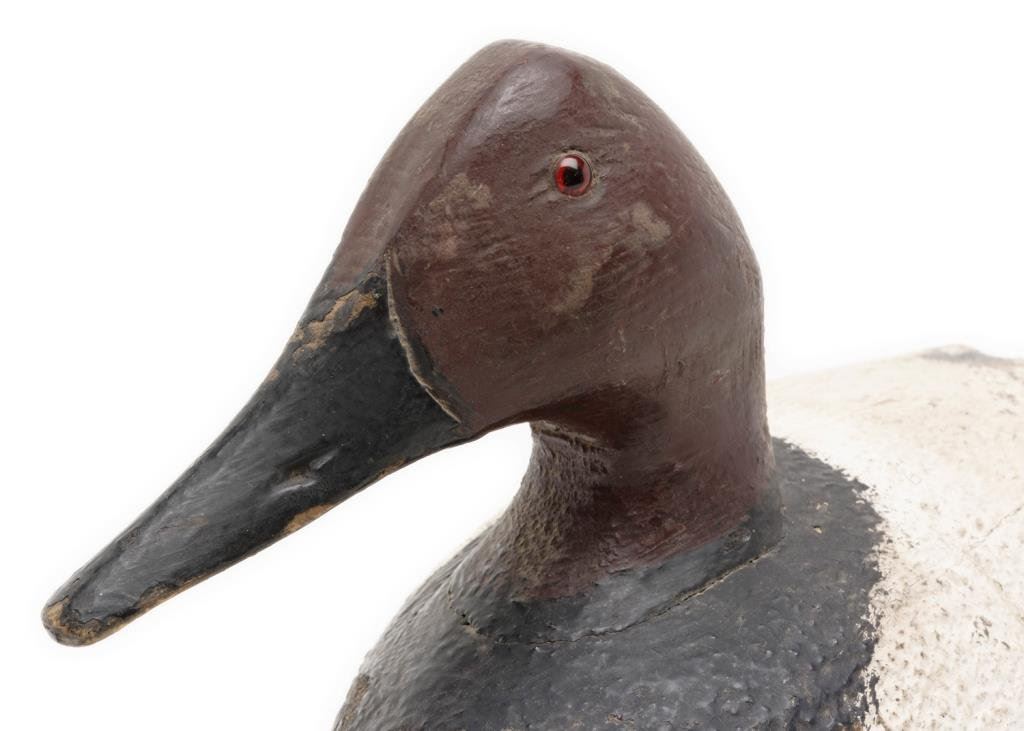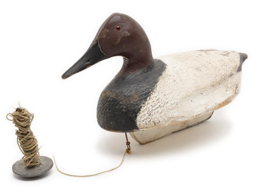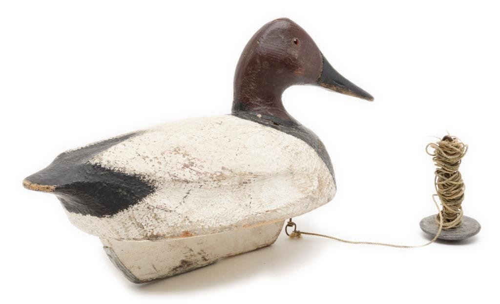 Great old carved wood duck decoy with glass eyes, approx. 16” x 8” x 7” with lead weight and string; considerable original appearing paint remaining; consignor’s note attached reads: “Carver: Elmer C. Schwerin, 1905-1990, Michigan – working decoys; carved in the 1930’s & 1940’s. Learned carving from Ed Schmidt, nephew of Master Carver, Ben Schmidt. Decoys were used for hunting in Saginaw Bay (Lake Huron) and Lake St. Clair in Michigan. Decoy bodies were cut from old cedar telephone poles. Heads were cut from cork or sugar pine. The weights were handmade, melted lead was poured in shallow molds & the bent wire was set in. Canvasback decoy-male-red head white back-handmade weight w/string, leaded keel”. Est.: $300-$500.