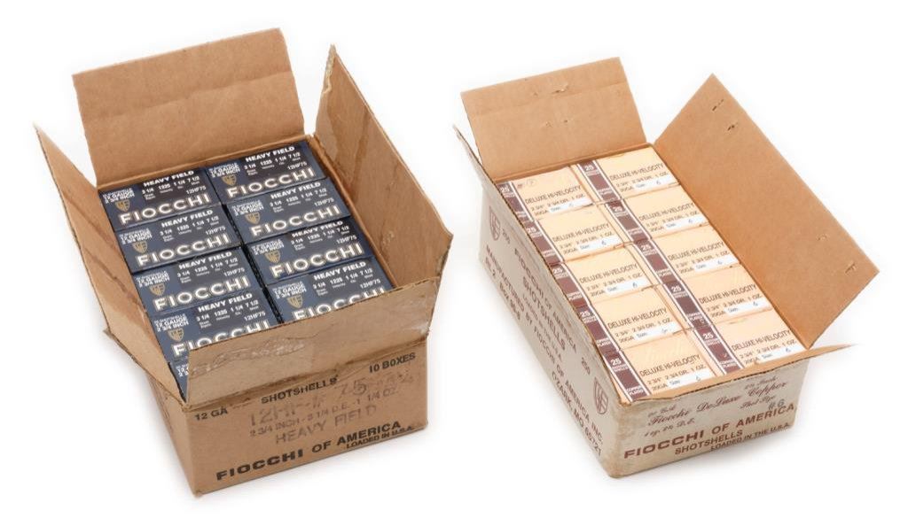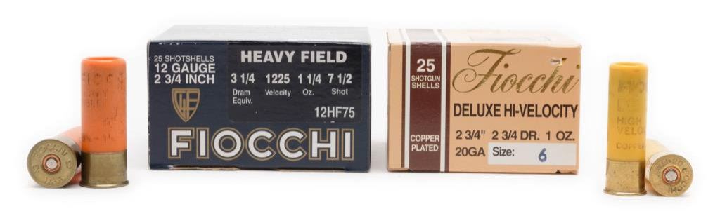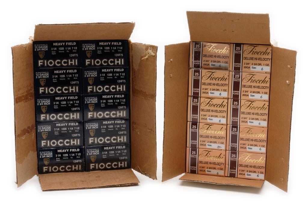 Lot of Fiocchi shotgun shells including 10 boxes of Deluxe Hi-velocity 20 gauge, 2-3/4 DR 1 oz. size 6 (9 full boxes, 1 partial) and 10 boxes of Heavy Fielde 12 gauge, 2-3/4 DR 1-1/4 oz. size 7-1/2 (9 full boxes, 1 partial). Est.: $75-$150.