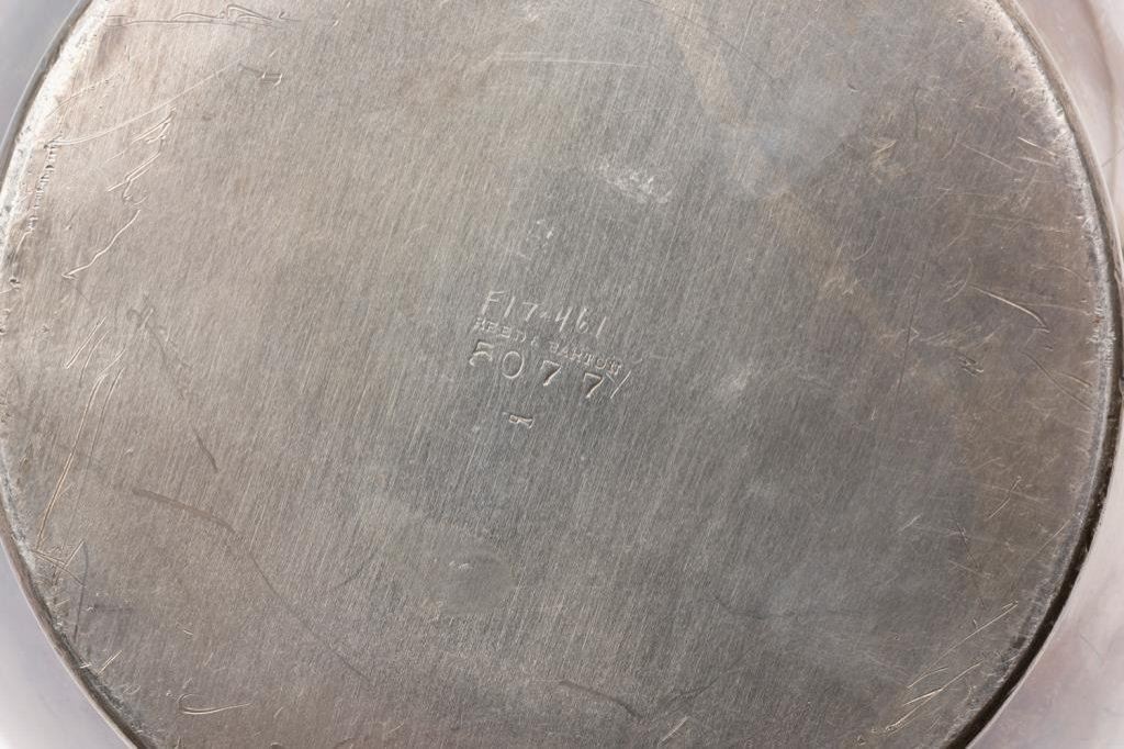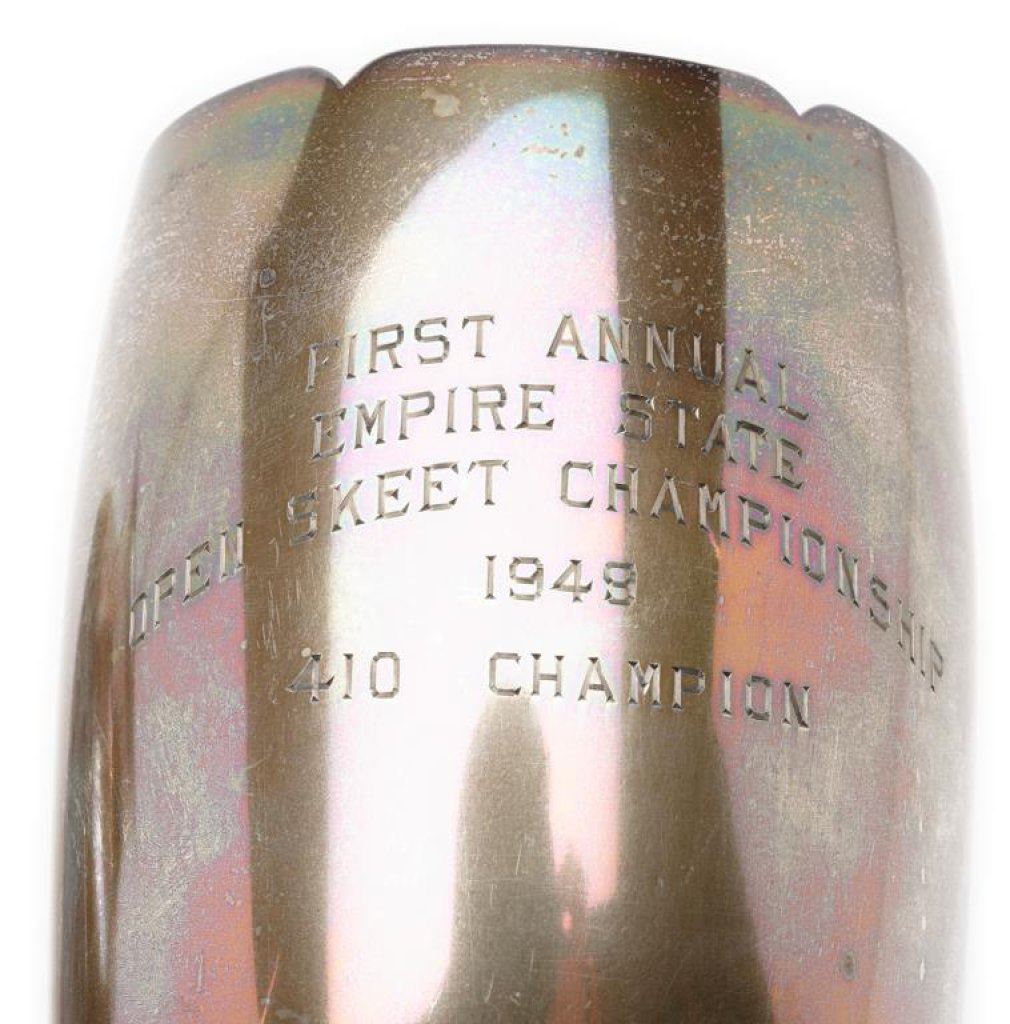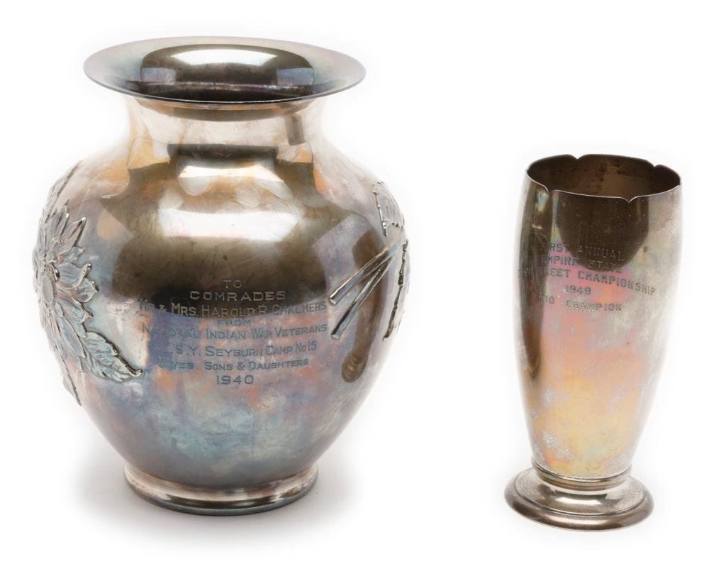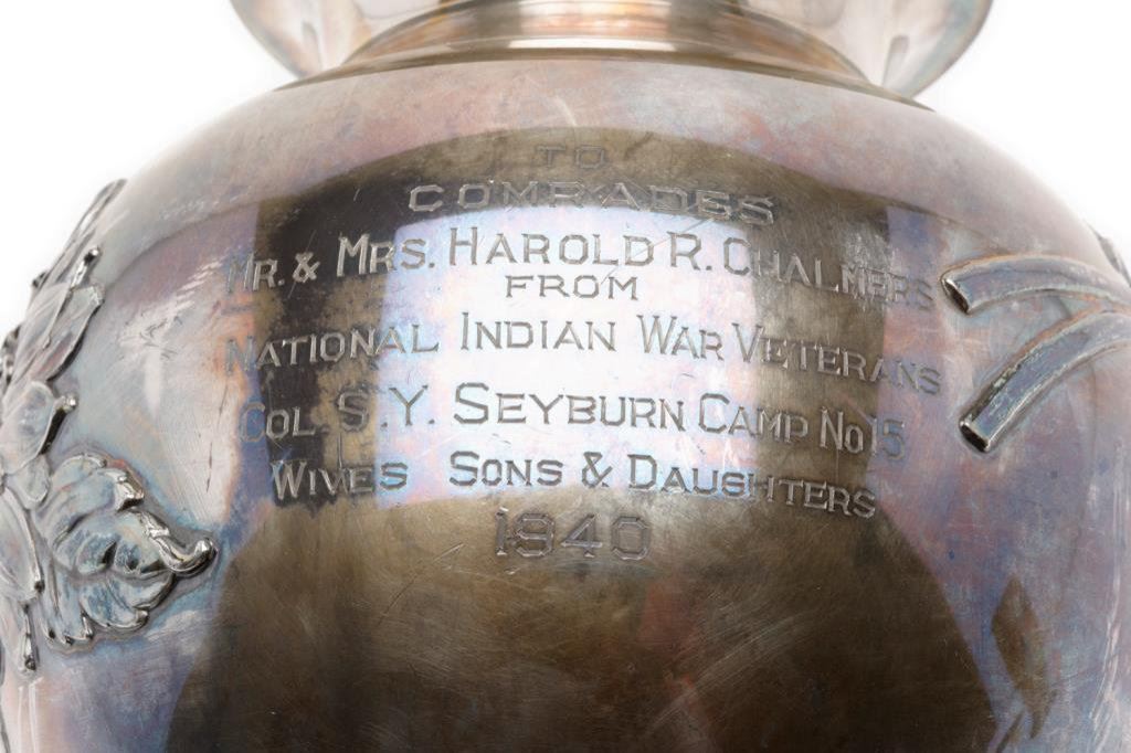 Striking sterling silver vase by Reed & Barton with inscription: “TO COMRADES MR. & MRS. HAROLD R. CHALMERS FROM NATIONAL INDIAN WAR VETERANS, COL. S.Y.SEYBURN CAMP No 15 WIVES SONS & DAUGHTERS 1940”; approx. 9” in diameter at widest point and 10” in height. Accompanied by a Sterling marked cup inscribed “FIRST ANNUAL EMPIRE STATE OPEN SKEET CHAMPIONSHIP 1949 410 CHAMPION”. (see Lot 569 for additional paper effects from the Seyburn family). Est.: $100-$200.