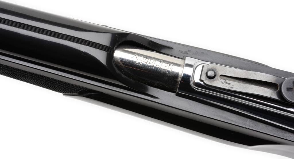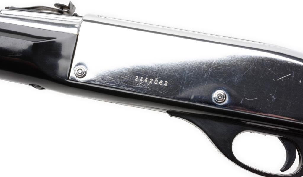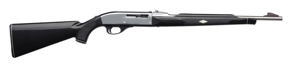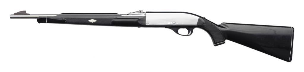++ Remington Nylon 66 semi-auto rifle, .22 Long Rifle caliber, S/N 2442063. The rifle is in overall very good to nearly fine condition with a 20” polished stainless barrel. The barrel and receiver retain nearly all of their polished stainless finish with a ramp front and adjustable rear sight. The black plastic stock is in overall very good condition showing only minor scuffs associated with storage. The action is crisp, markings sharp and bore very good on this collectible Remington. Est .: $250-$500.