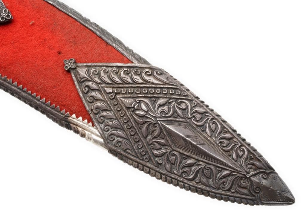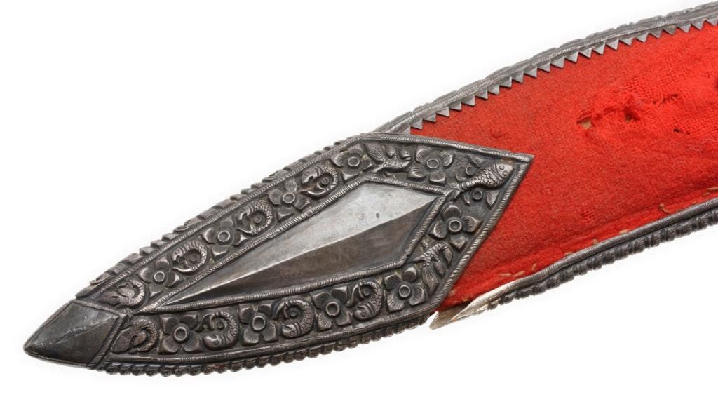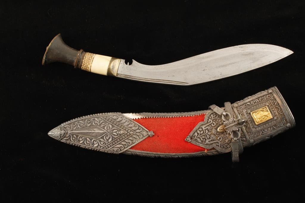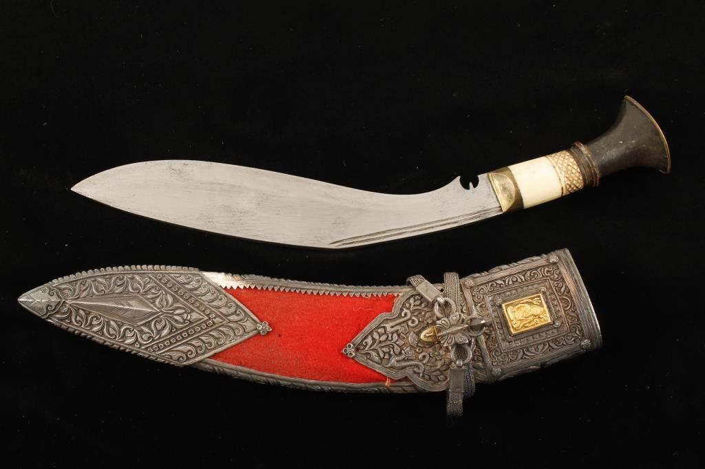Lot 571 Fancy Tribal Gurkha with ornate metal sheath and bone handle. The knife i
