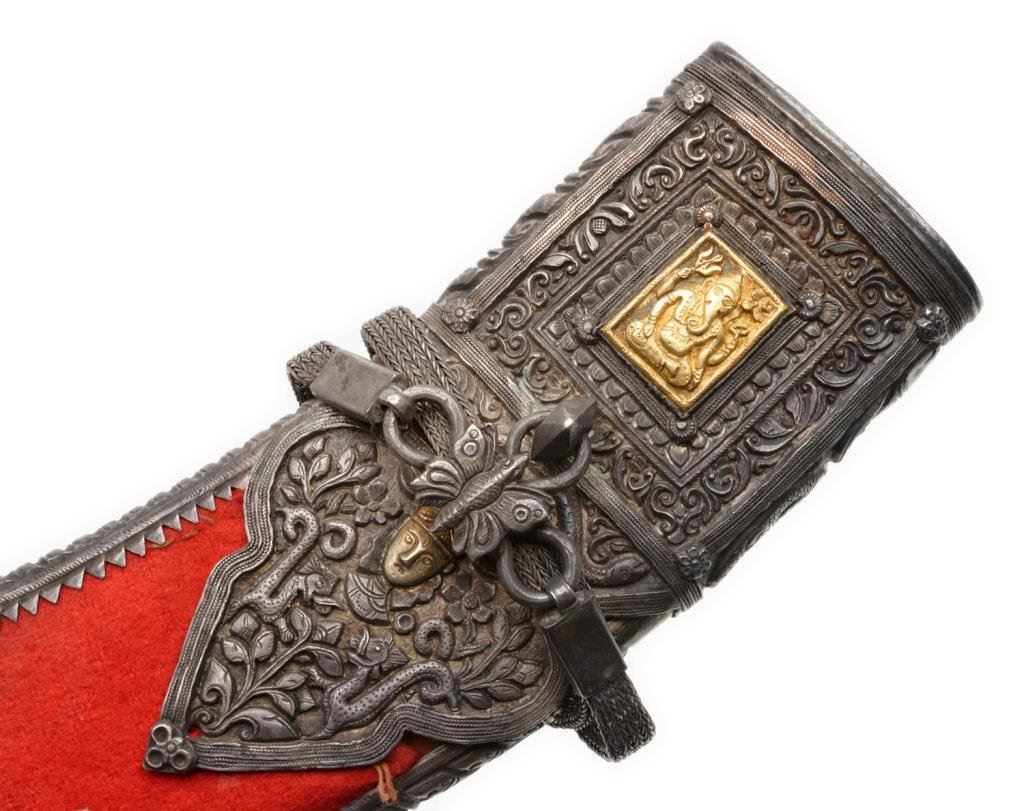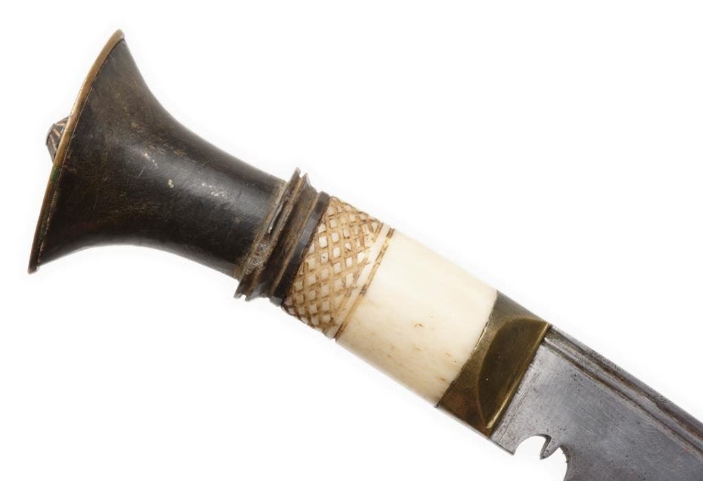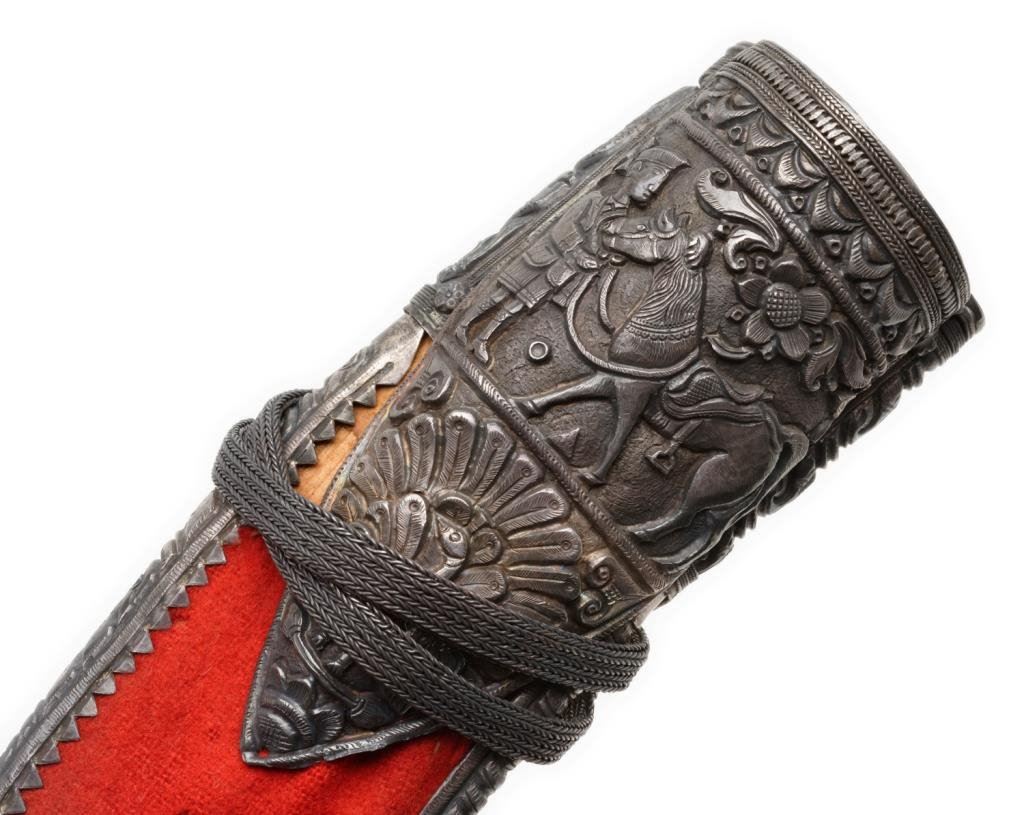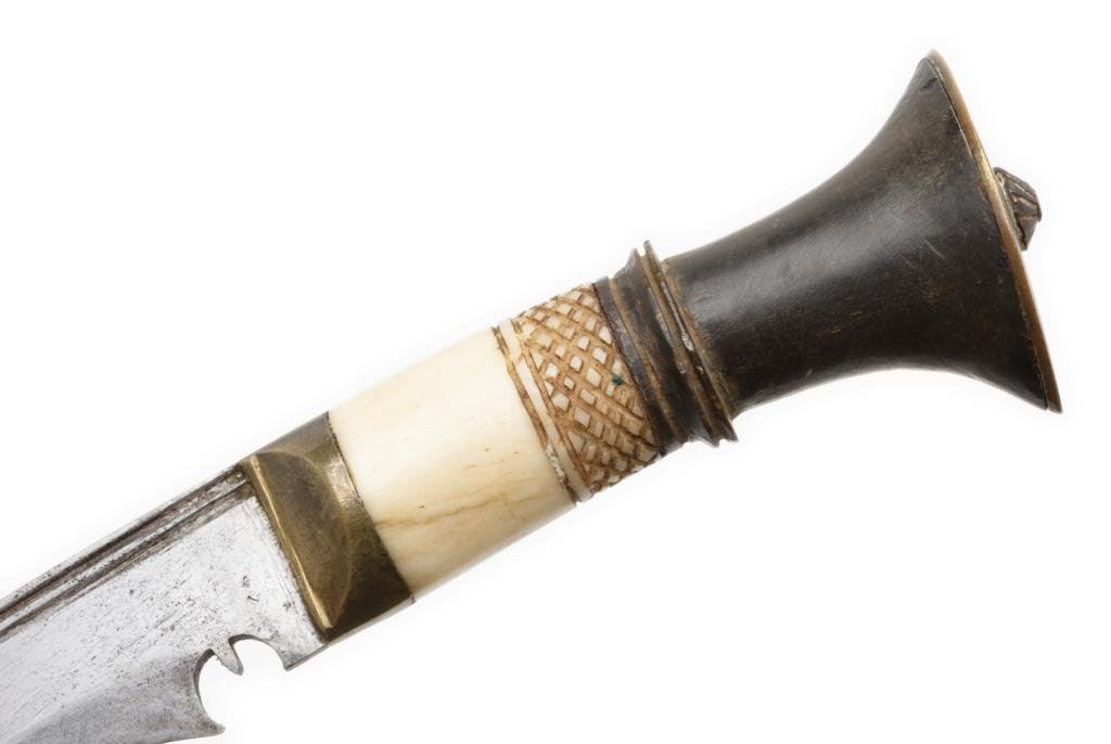 Fancy Tribal Gurkha with ornate metal sheath and bone handle. The knife is in overall very good condition with an overall length of 13” and a 9” blade. The carved ivory and horn handle shows some chipping at the pommel but is in otherwise good condition. The blade is in good condition with some polishing and slight surface erosion. The handle is complete with a brass pommel , bolster and crude checkering. The metal sheath has a pleasing patina which features a fancy design incorporating crossed gurkhas and peacocks, along with braided metal ropes adorning the front . Est.: $250-$500.