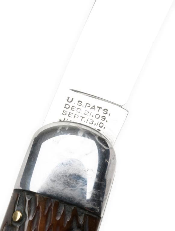 Rare Shrade Cutlery Co. mechanical pocket knife with stag slabs, approximately 8.5” overall with a 4” blade marked “SHRADE CUT.CO./WALDEN, NY” on one side of the knife’s base and “U.S. PATS. DEC. 21,09/SEPT. 13,10/JUNE 6,16”. This pocket knife is in fine overall condition. NO CALIFORNIA SALE; SHIPPED FROM ARIZONA. Est.: $225-$450.
