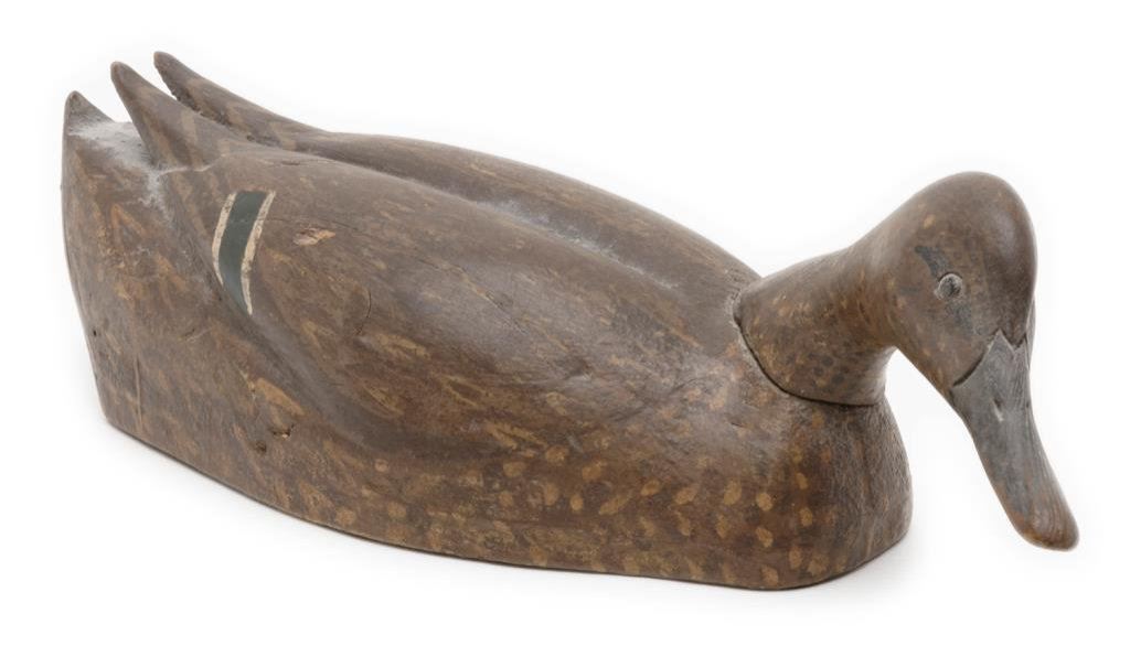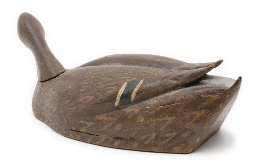 Old carved wood duck decoy, approx. 16” x 6” x 4”, showing what appears to be the majority of its brown, white and green paint; glass eyes; consignor’s note indicates “Pappy Kidwell Swimming Duck”. Nicely done and proportioned. Est.: $300-$500.