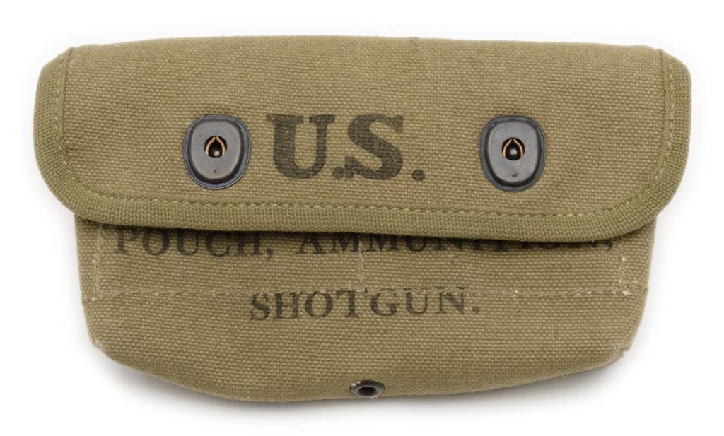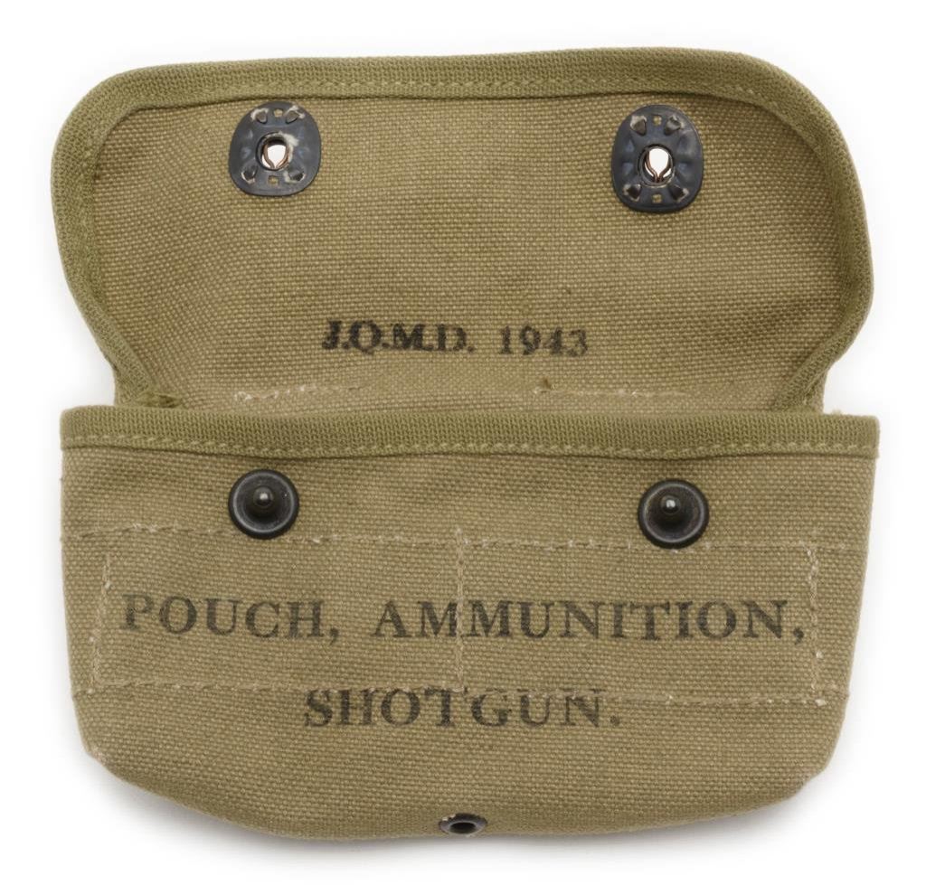 WW II era U.S. olive green woven pouch for shotgun ammunition marked “J.Q.M.D. 1943” in near mint condition showing little handling. Est.: $100-$150.