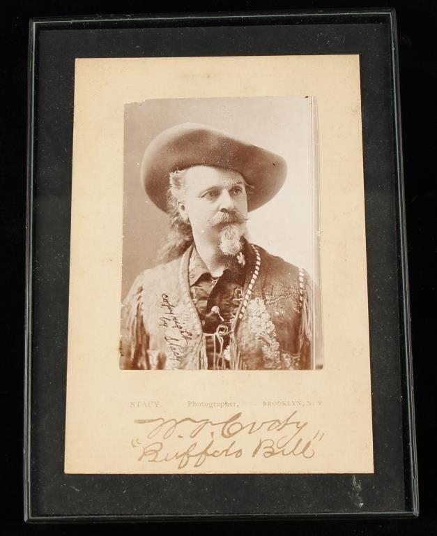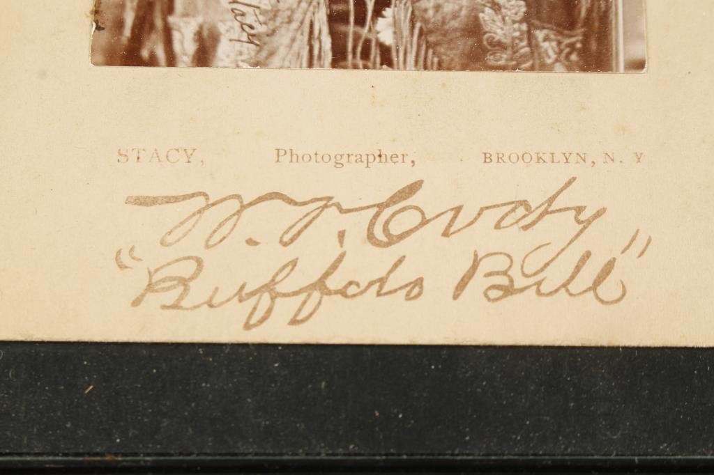 Framed early photo advertising cabinet card of Buffalo Bill Cody by Stacy of Brooklyn, N.Y. in overall very good condition. Est.: $75-$100.