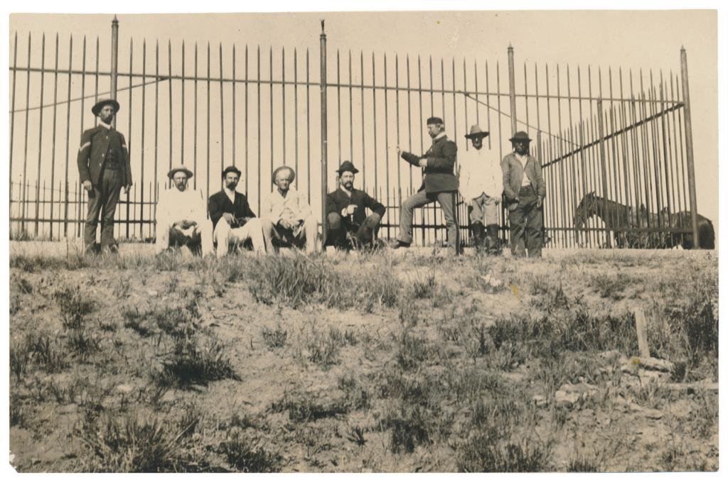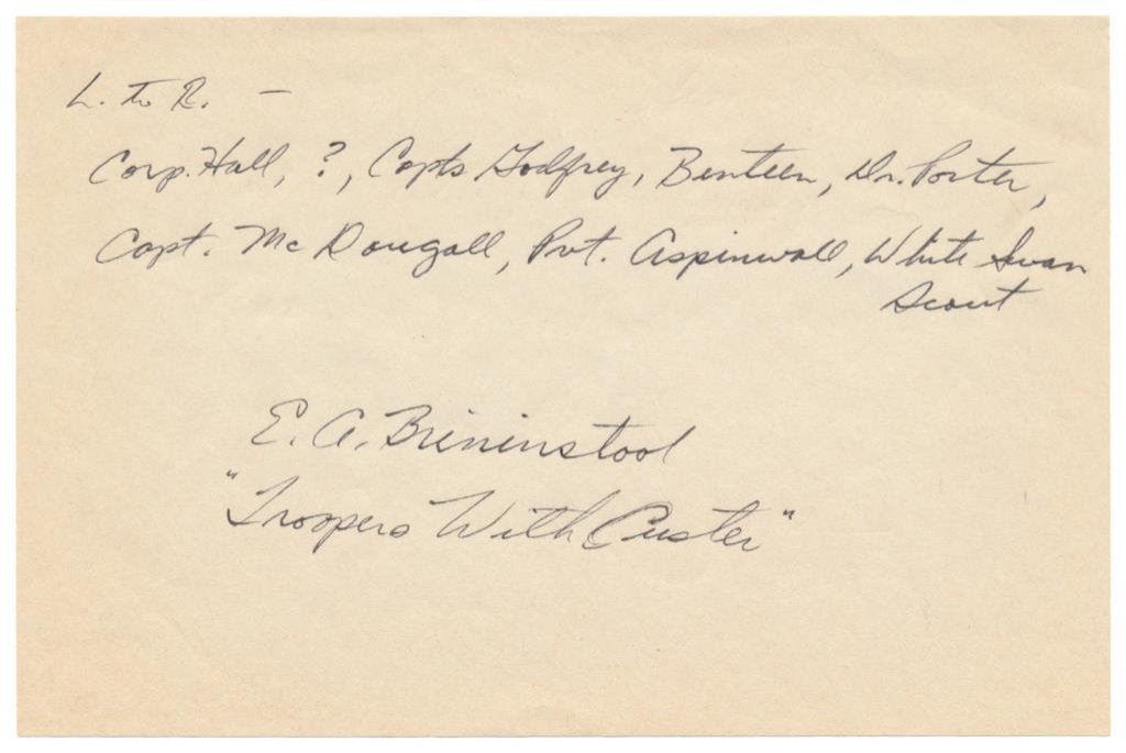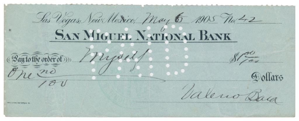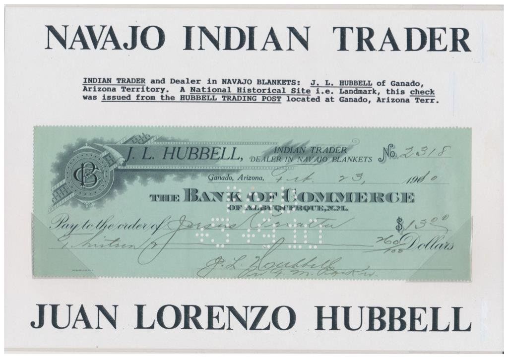 Western paper lot of 8 pieces including a wagon train photo; an early cabinet photo of the San Juan Mission; a small photo of Tucson, AZ ca 1898; an old photo of 8 men at the Custer Battlefield (credited to D.F. Barry) including Corporal Hall, Dr. H.R. Porter, Capt. E.S. Godfrey, General Benteen, Capt. W.S. Edgerly, Capt. Theo. McDougall, Private Aspinwall and Indian Scout “White Swan”; a cabinet photo of the famous “Jersey Lily”, Mrs. Langtry; a cabinet photo of a lady in her finery by J.C.H. Grabill of Deadwood and Sturgis, Dakota Territory; a 1910-dated canceled check from J.L. Hubbell, Indian Trader and a canceled check drawn on the San Miguel National Bank of Las Vegas, NM Terr., dated 1905 and signed by Valerio Baca, a descendant of the famed Spanish pioneer Baca Family of early New Mexico. Est.: $175-$275.