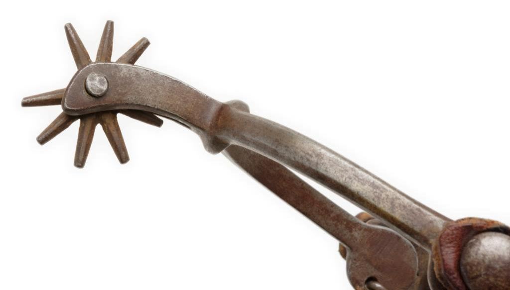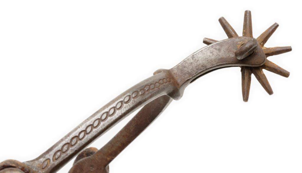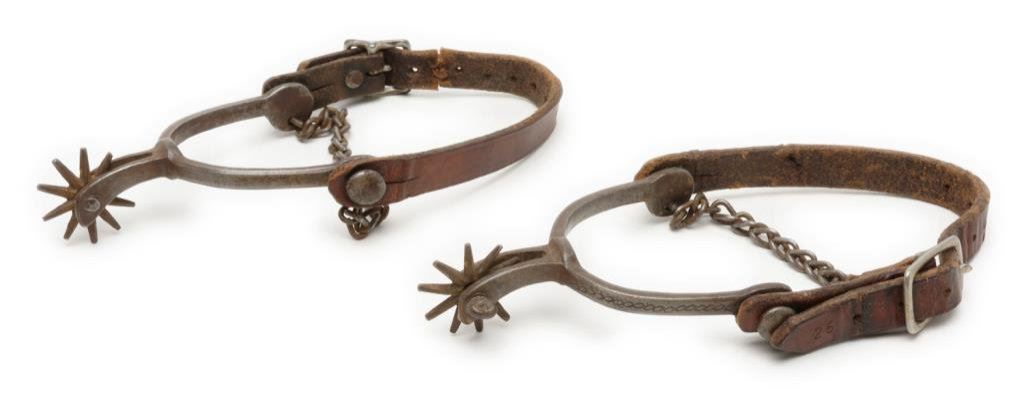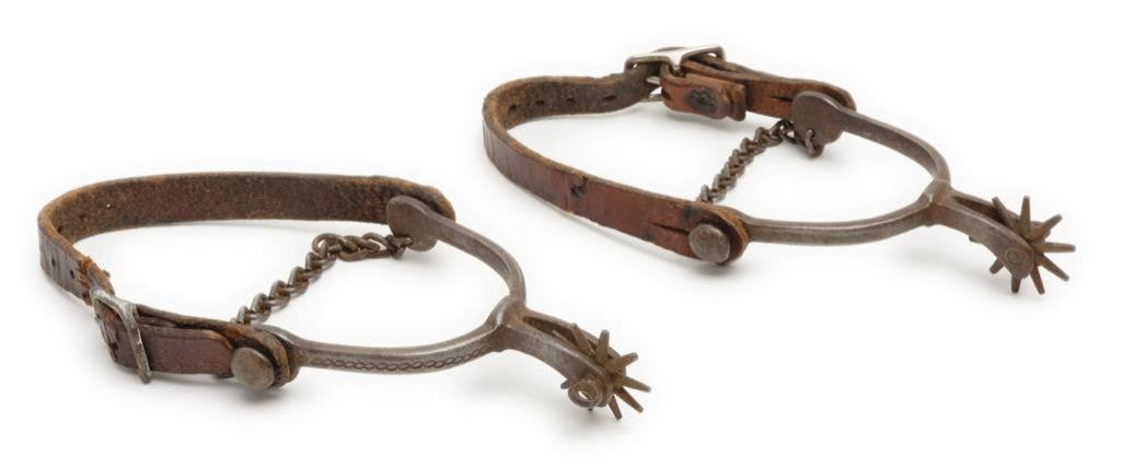 Pair of cavalry style spurs with chains and straps, small rowels; overall good condition. Est.: $75-$125.