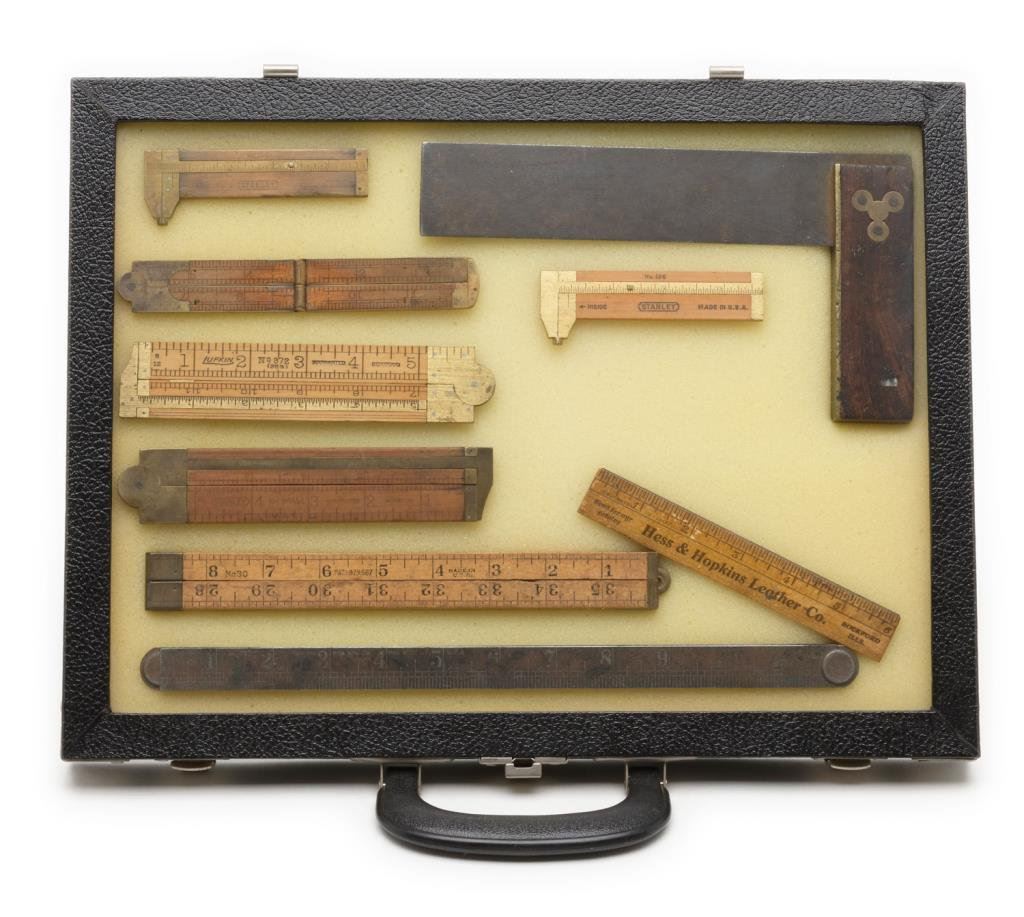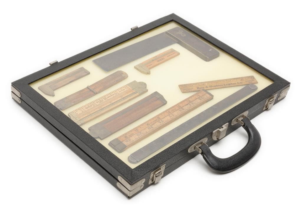 Lot of 9 old measuring devices, mostly wood and brass including makers like Stanley and Lufkin. All displayed in a protective riker case. Est.: $50-$100.