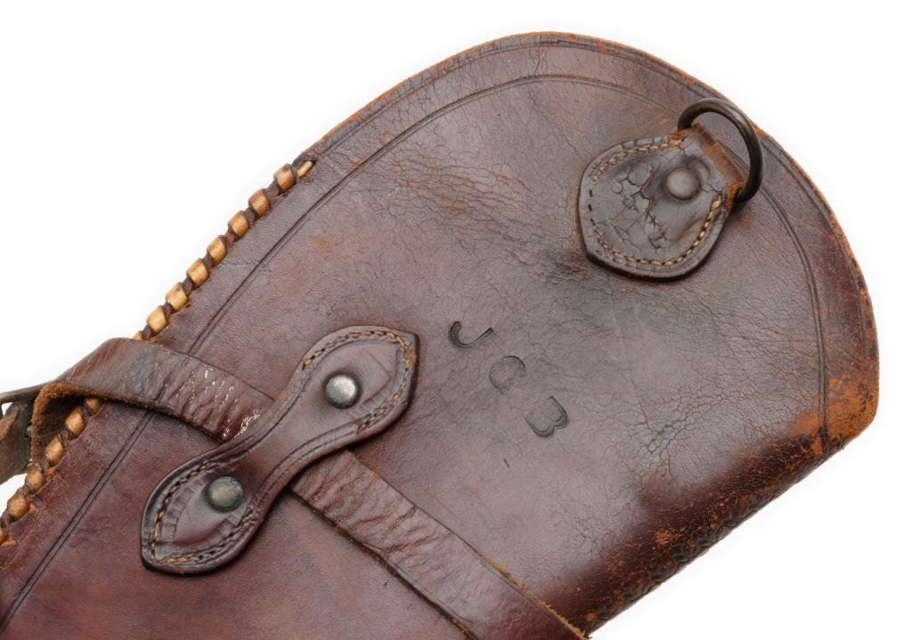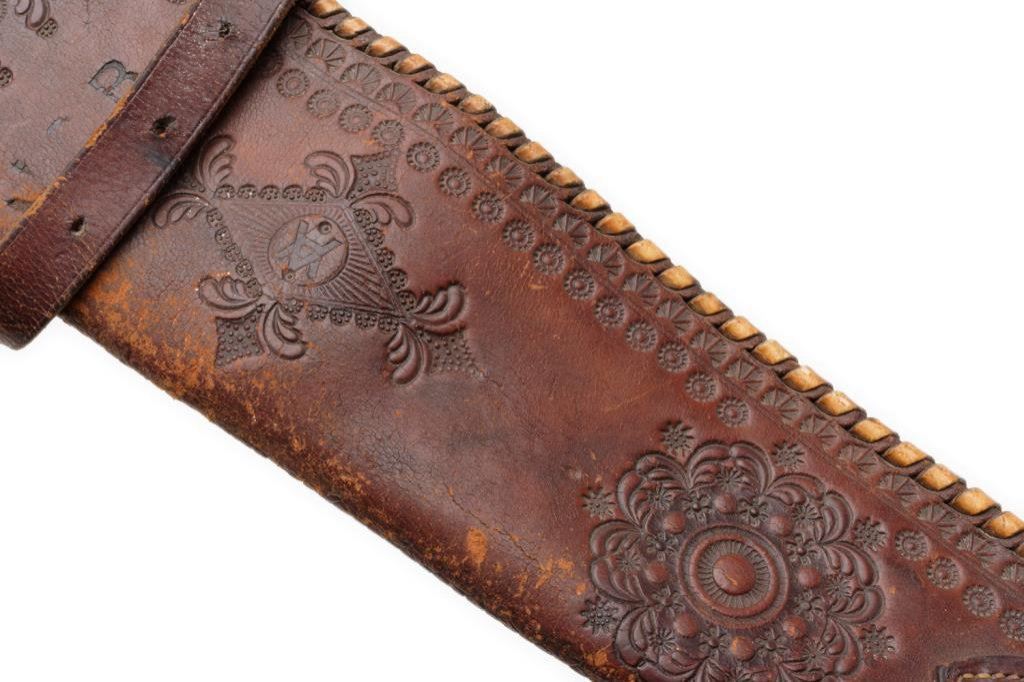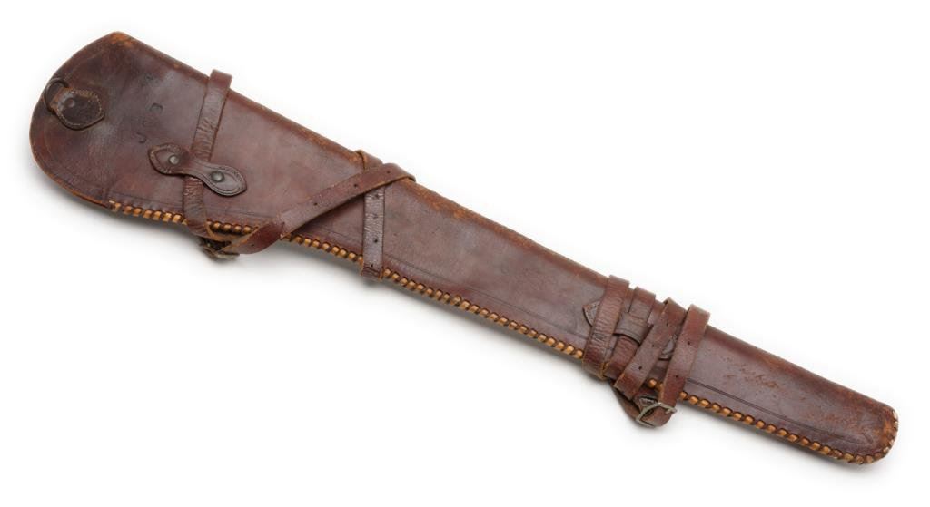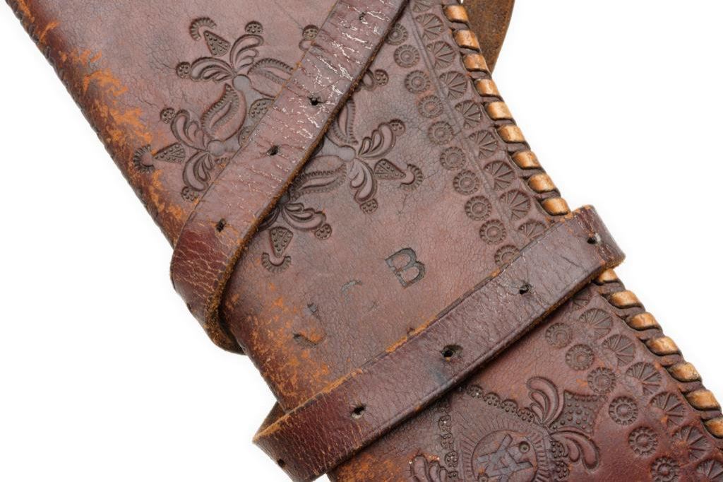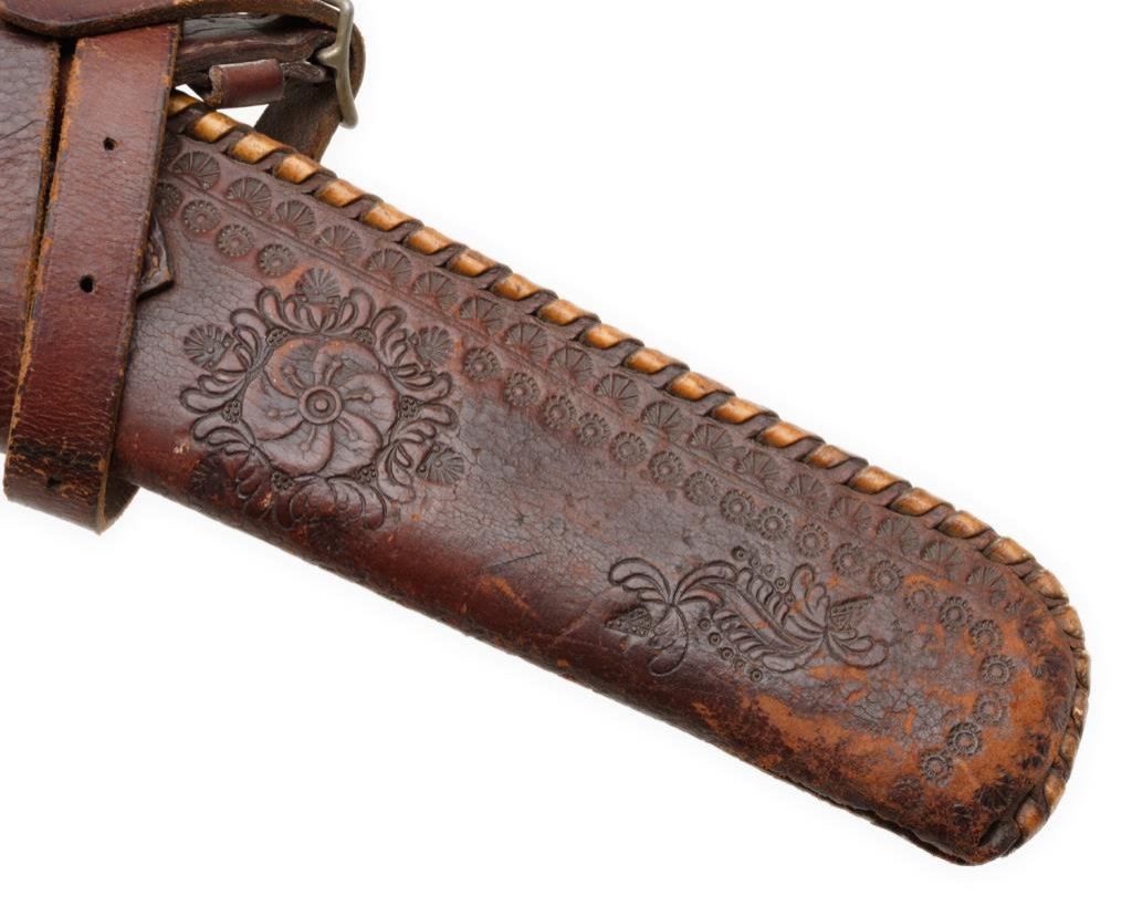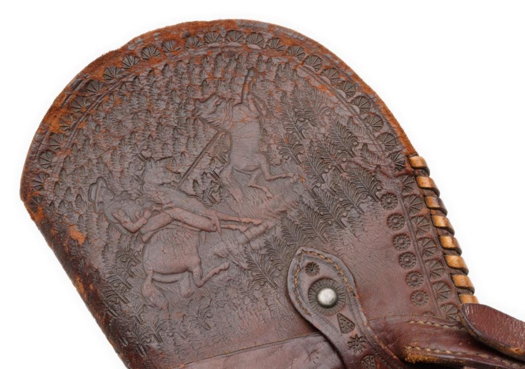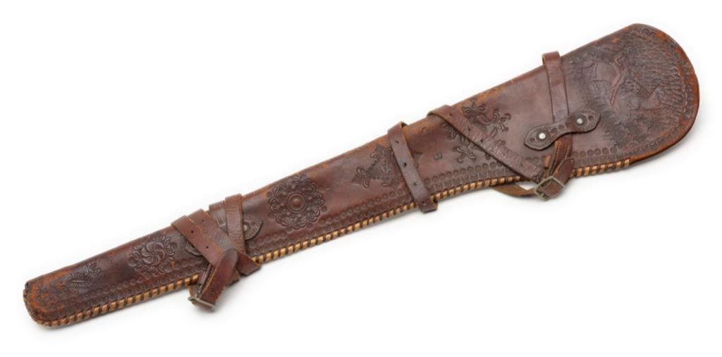 Tooled leather rifle scabbard with strap in overall worn but good condition marked “JCB” and including in the tooling a cowboy roping a horse. Est.: $75-$150.