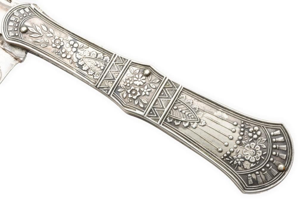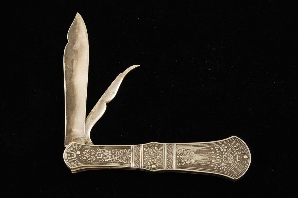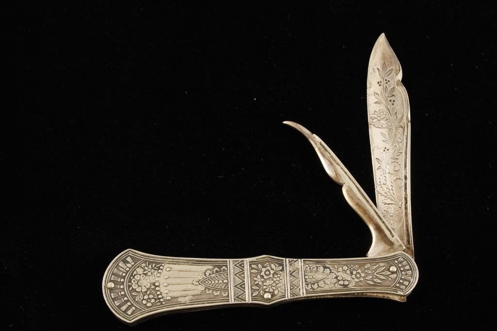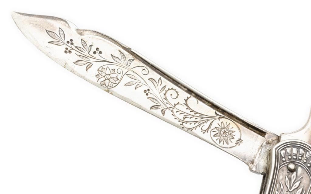 Extra fancy all silver two blade pocket fruit knife, approximately 3.25” overall closed; beautifully and fully decorated body and engraved knife blade; overall very good to fine condition. Est.: $75-$150.