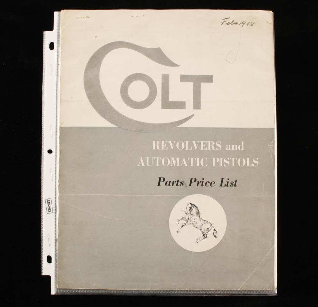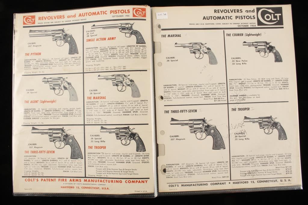 Lot of 5 original Colt Manufacturing Co. dealer pricing documents including one dated Feb. 1948; another dated Oct. 1954; 2 dated Feb. 1955 and one dated 1956, all covering the various Models offered of revolvers and semi-automatic pistols; interesting ephemera for the Colt collector. Est.: $50-$75.