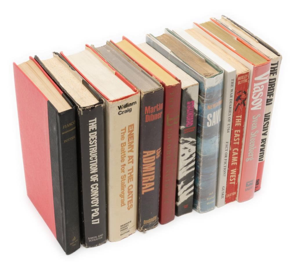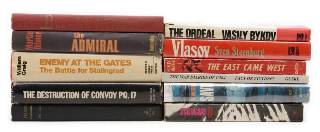 Lot of 8 hardback and 3 softcover books on WW II subjects including The Bedford Incident by Rascovich, The Admiral by Dibner and Enemy at the Gates: The Battle for Stalingrad by Craig. Est.: $75-$100.