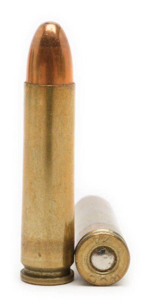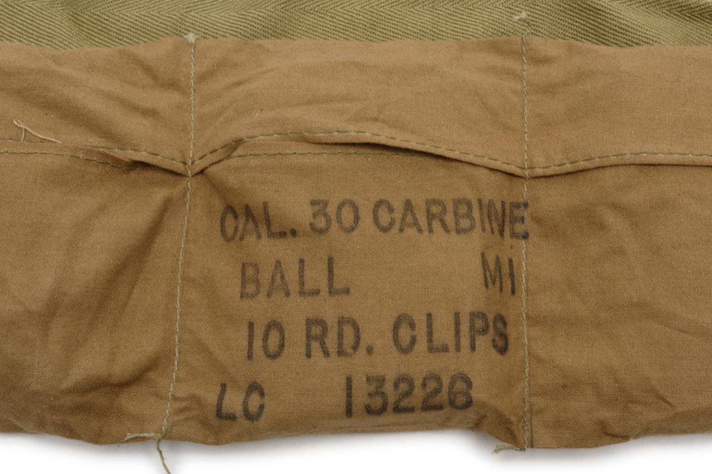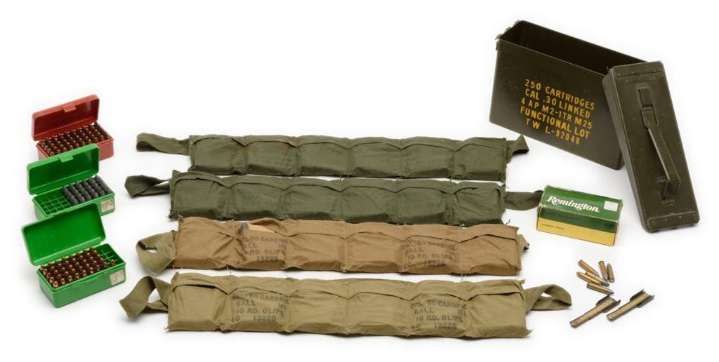 Misc. lot of .30 caliber carbine ammunition including 4 green military bandoliers of cartridges, a box of .30 caliber cartridges and 3 plastic Case Guard boxes (2 partials) of reloaded .30 caliber cartridges (for brass only; not to be fired). Est.: $50-$100.