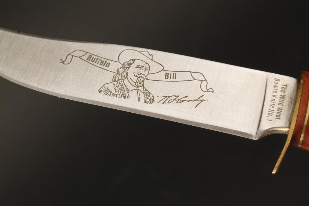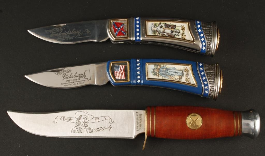 Lot of 2 Franklin Mint and 1 American Mint collector’s knives; one Franklin Mint knife is a pocket folder commemorating U.S. Grant, the other commemorates Robert E. Lee. Both are in like new condition and each is in a Franklin Mint soft case. The American Mint collector knife is a fixed blade commemorating Buffalo Bill Cody and is approximately 9” overall with a 5” blade and also in like new condition. Est.: $100-$175.