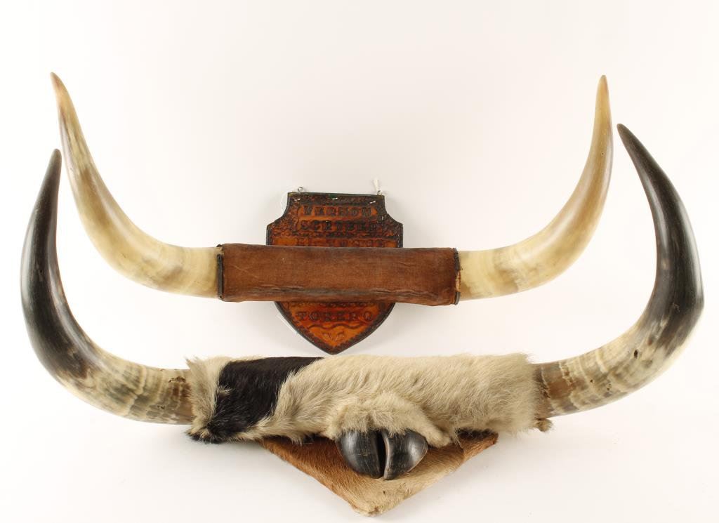 Lot of two sets of steer horns on plaques. The first measures approximately 25” across and is mounted on a leather covered plaque inscribed, “Vernon Scriber, El Toros, Torero.” The second, measures approximately 24” across with a hide covered plaque and a hoof mounted beneath. The horns show some small mars due to insects, but are otherwise in good condition. An interesting lot. Est.: $25-$75.