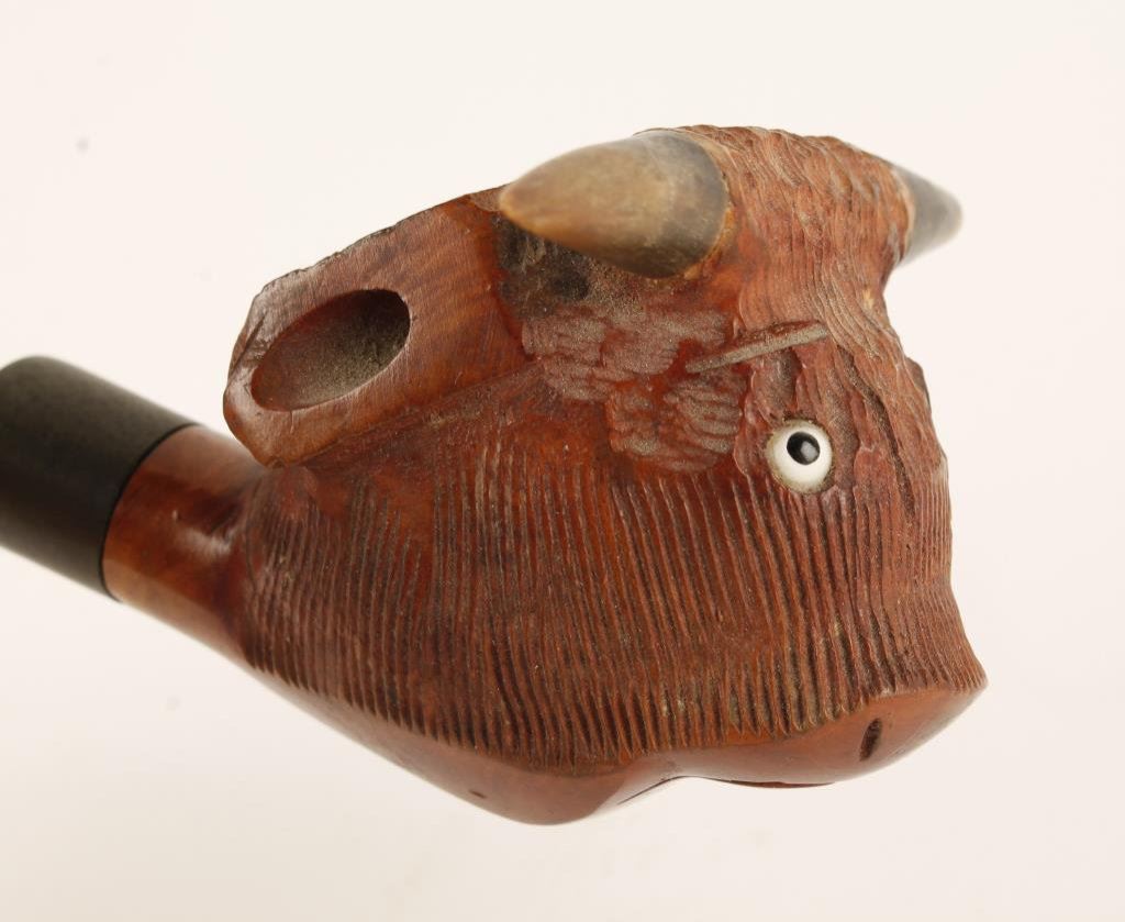 Lot 664 Antique hand carved wooden smoking pipe in form of a steer with glass eyes
