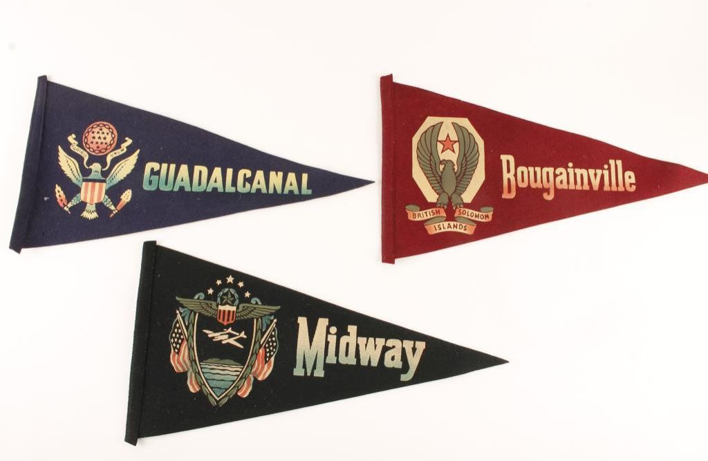 Lot of 3 WW II era battle pendants, each approximately 17” long x 9” at widest points marked “GUADALCANAL”, “BOUGAINVILLE BRITISH SOLOMON ISLANDS” and “MIDWAY”. All in overall very good condition. Est.: $75-$125.