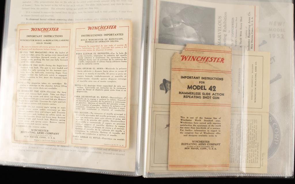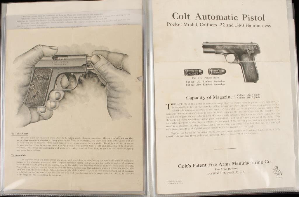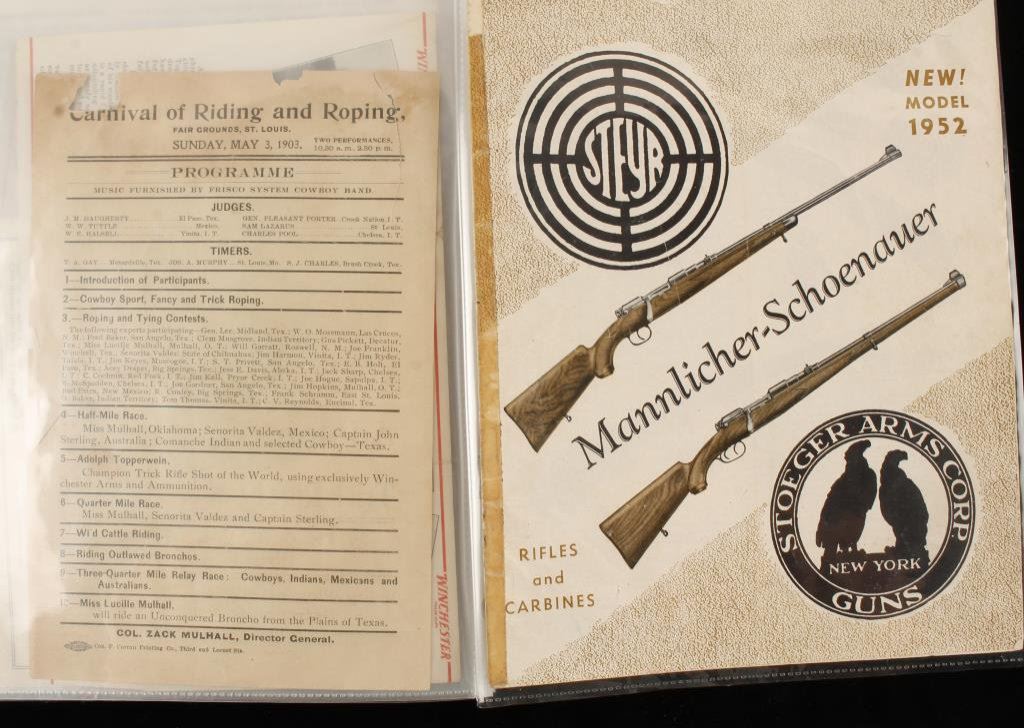 Bonanza lot of early gun-related paperwork including an original instruction manual for the Colt Woodsman Match Target Model pistol; an original 8-48 dated instructions pamphlet for the Colt .22 Conversion Unit; an original instructions pamphlet for the Colt Ace Automatic Pistol; an original instructions pamphlet for the Colt Pocket Model .25 Automatic Pistol; an original instructions pamphlet for the .32 or .380 Colt Pocket Model Automatic Pistol; an original Winchester instructions pamphlet for the Model 94 lever action carbine and one for the Model 42 hammerless slide action repeating shot gun; three different advertisers for shooting exhibitions by “Ad” Topperwein and a Stoeger Arms Corp. sales pamphlet on the Steyr Mannlicher- Schoenauer Model of 1952 rifles and carbines. Est.: $75-$125.