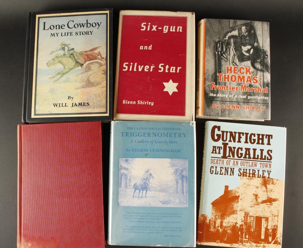 Lot of 6 early hardback research books including a 1st edition (1949) of “Marshal of the Last Frontier; life and service of Bill Tilghman” by Zoe Tilghman; “Triggenometry: A Gallery of Gunfighters” by Eugene Cunningham; a 1st edition (1955) “Six-gun and Silver Star” by Glenn Shirley; a 1st edition (1962) “Heck Thomas: Frontier Marshal” also by Shirley; another 1st edition by Shirley entitled “Gunfight at Ingalls: Death of an Outlaw Town”; and a 1942 illustrated edition of Will James’ “Lone Cowboy, My Life Story”. Est.: $75-$125.