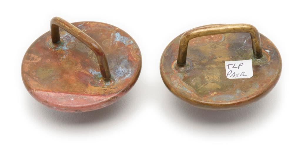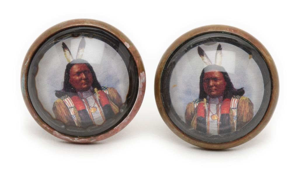Pair of beautiful matching rosettes with color pictures of Indian warrior in full regalia; very good to fine condition. Est.: $50-$100.