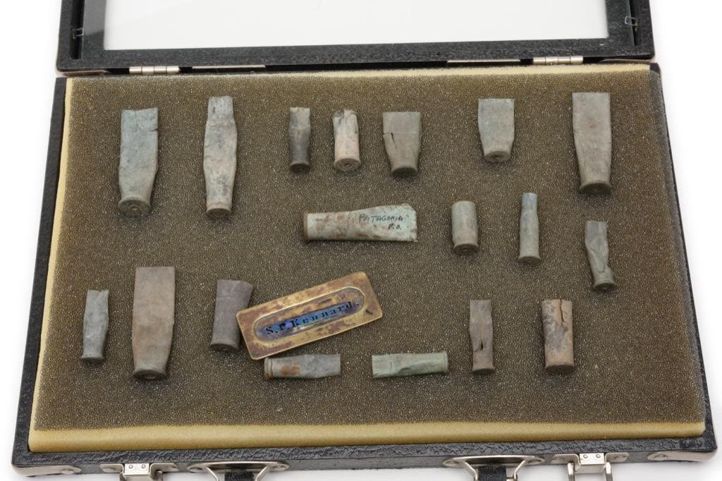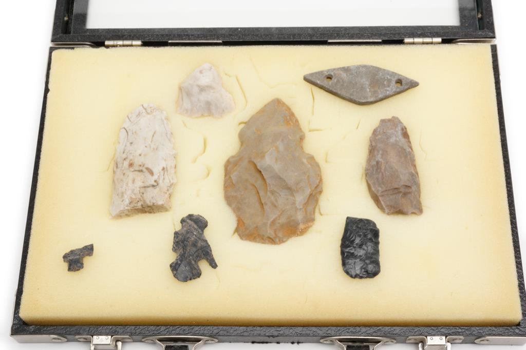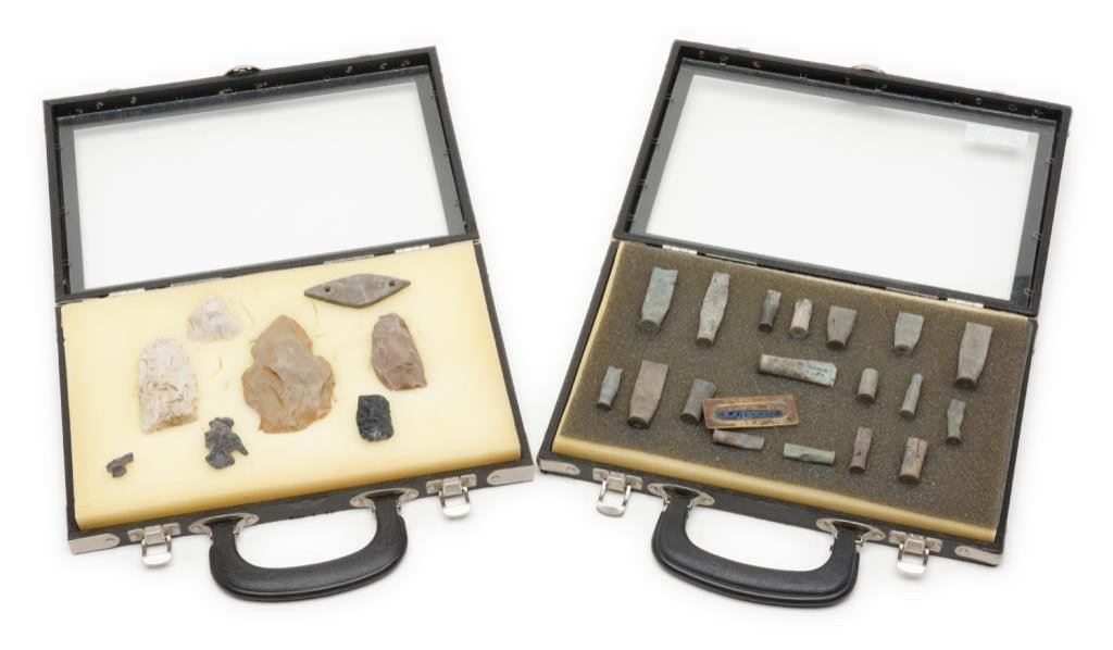 Two riker cases of Old West artifacts including a grouping of dug-up cartridge shells and a brass stencil maker from around the P.O. Ranch in Patagonia, Arizona; also some misc. stone arrowheads and a stone scraper. Est.: $50-$100.