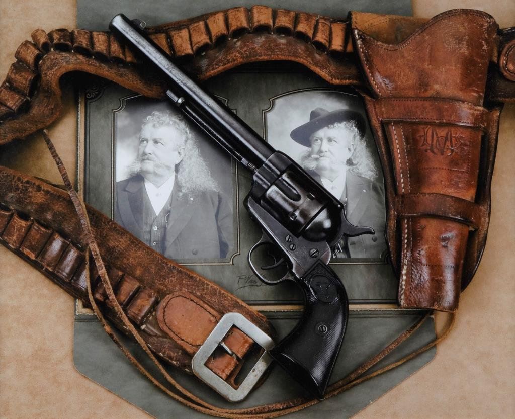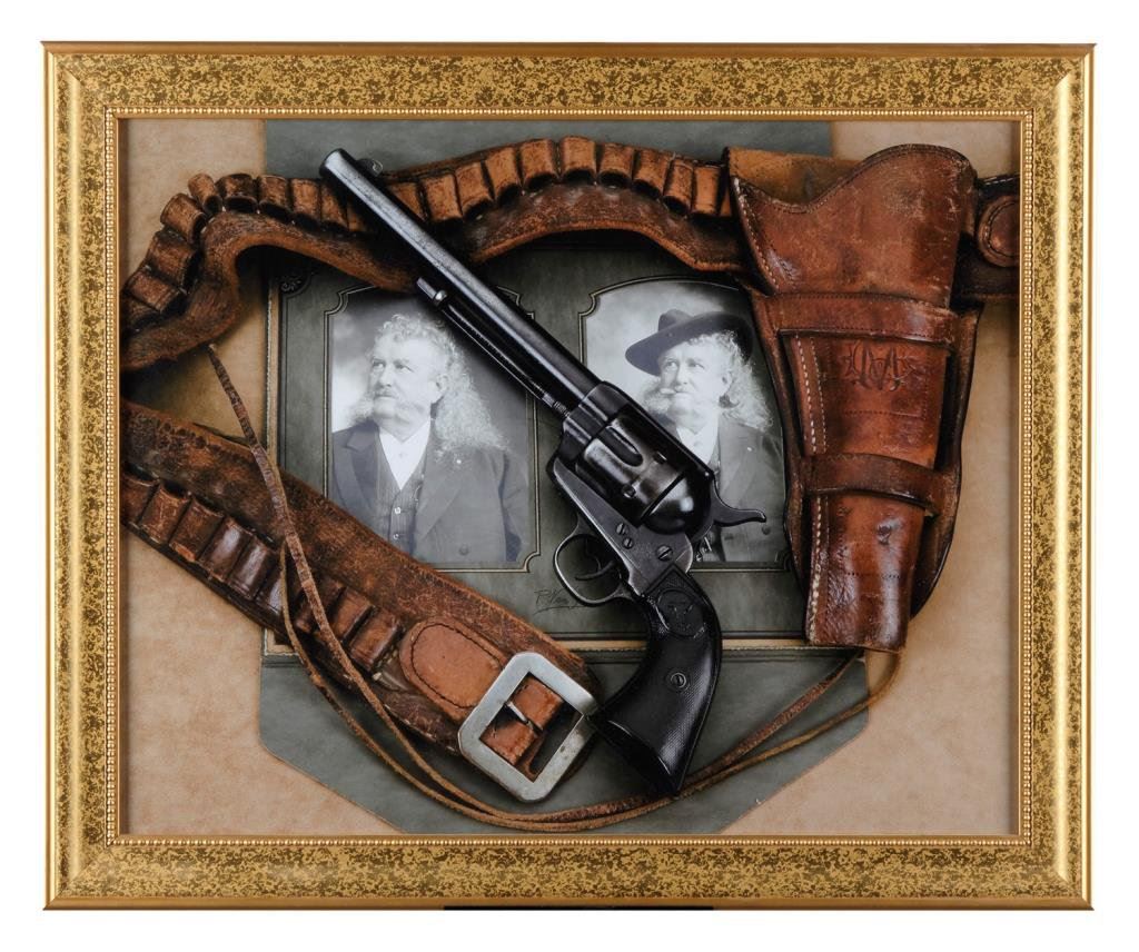 Large framed detailed color photo of Major John Burke’s Colt SAA, holster, cartridge belt and photo portraits, approx. 19” x 23” overall by noted firearms photographer Paul Goodwin. Burke was an early Indian Scout and later Buffalo Bill Cody’s business manager and press agent. A great decorator for any Western theme room or office. Est.: $50-$75.