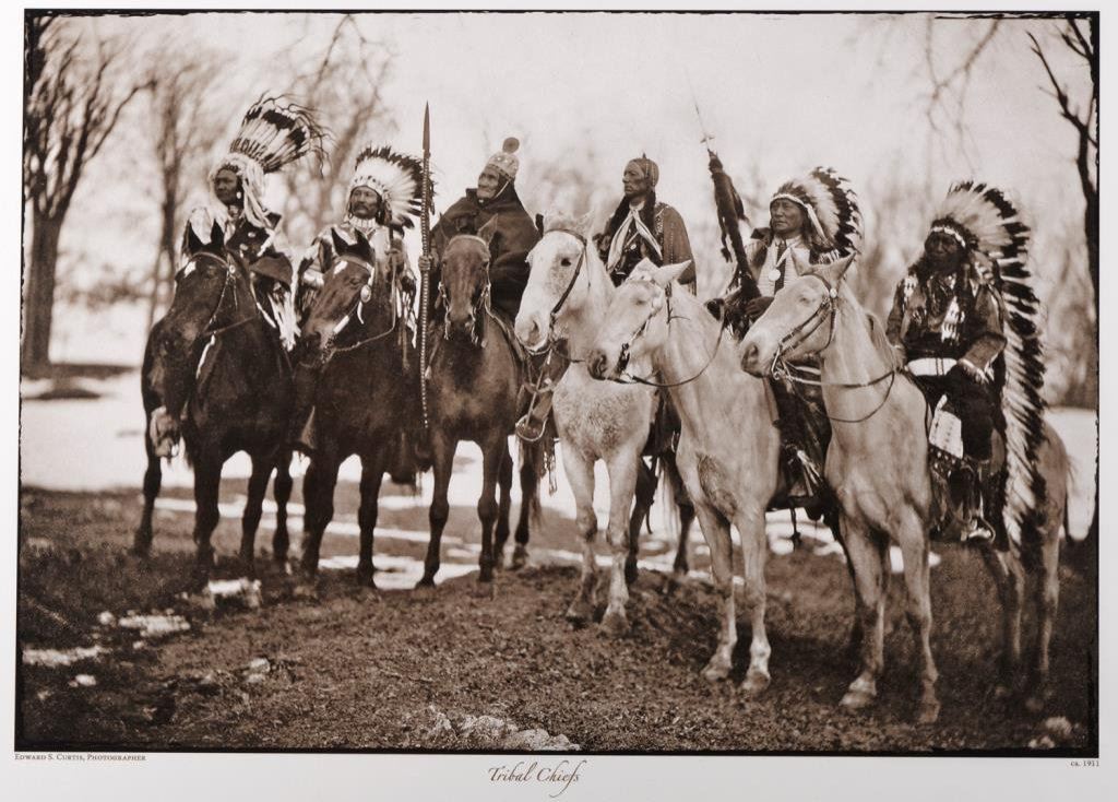 Large high quality photocopy on heavy stock professional paper with hardboard and plastic wrapping of Edward S. Curtis’ 1911 photo entitled “Tribal Chiefs”, approx. 17” x 22” overall showing the Chiefs on horseback and including such notables as Geronimo, Quanah Parker and American Horse. Est.: $50-$100.
