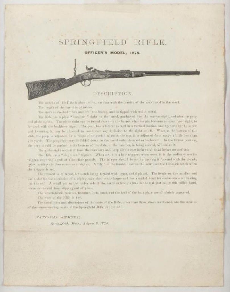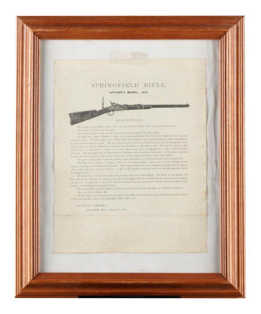 Framed original flyer for the Springfield Officer’s Model 1875 Trapdoor Sporting rifle by the National Armory, Springfield, Mass and dated August 2, 1875. Est.: $50-$75.