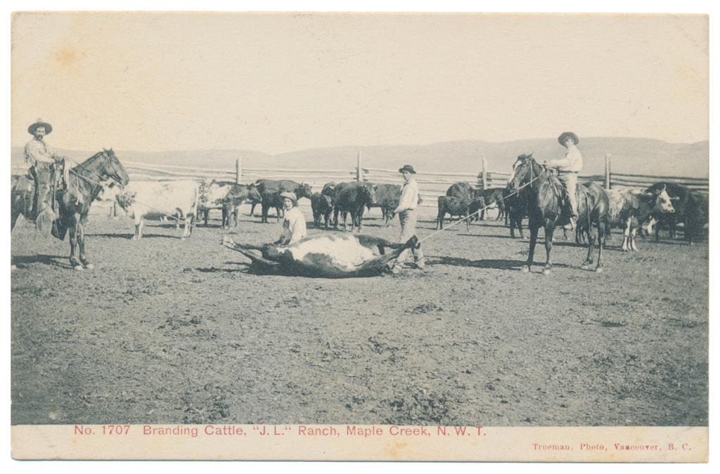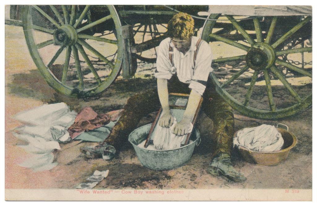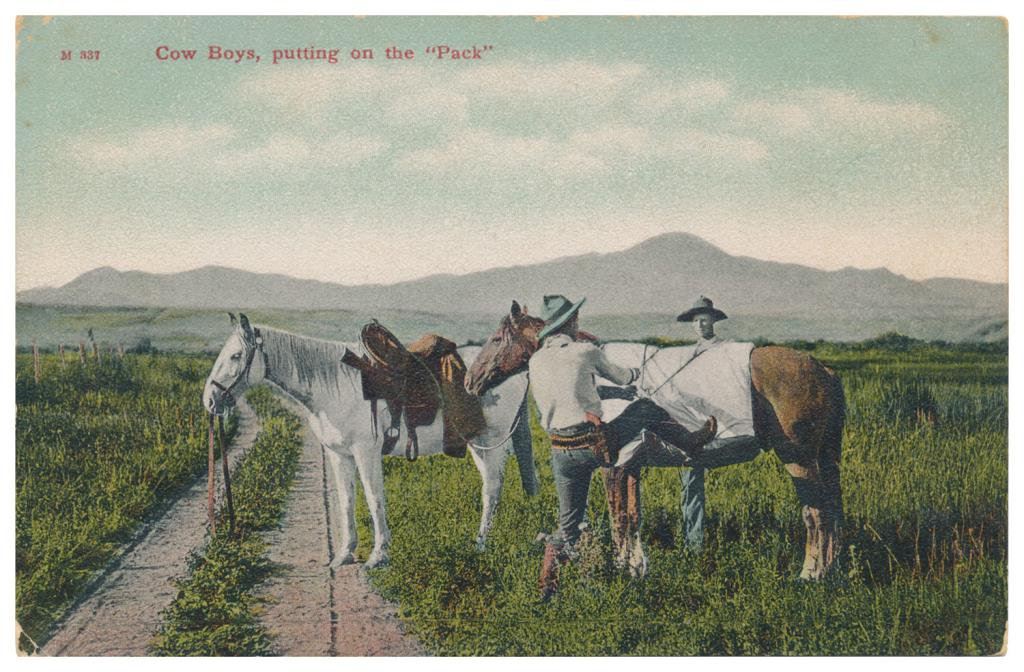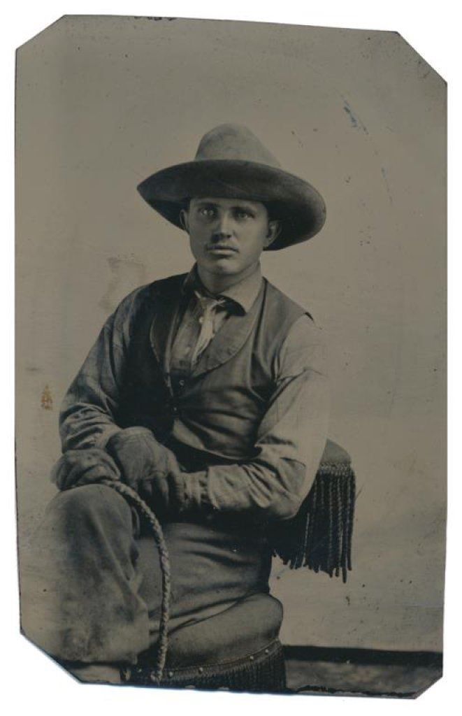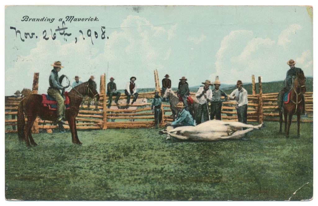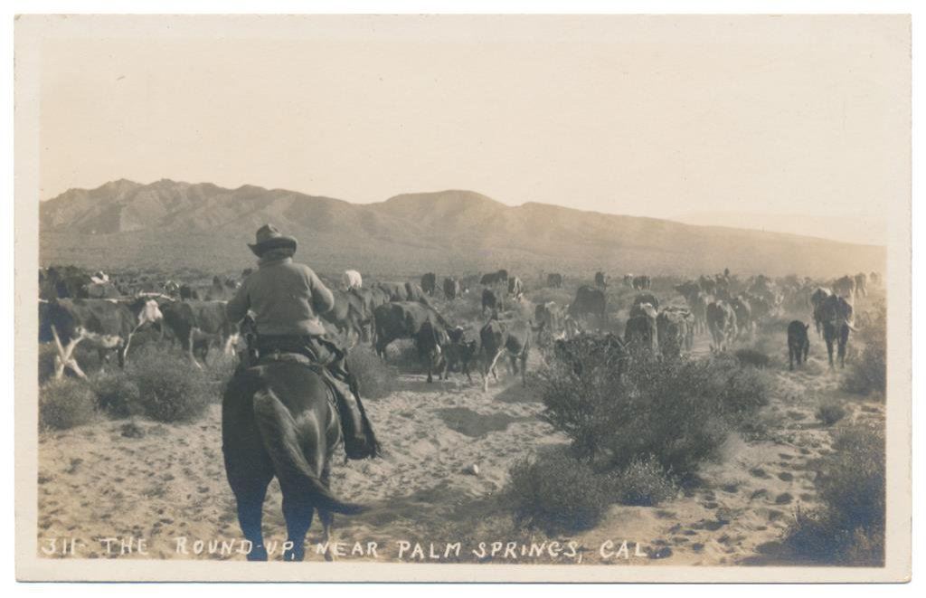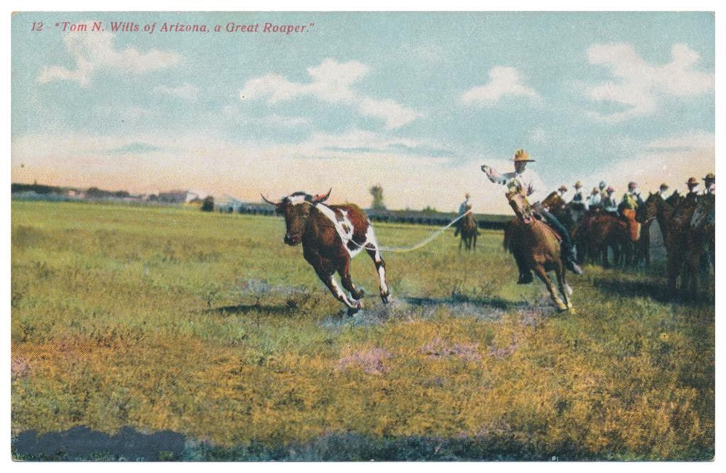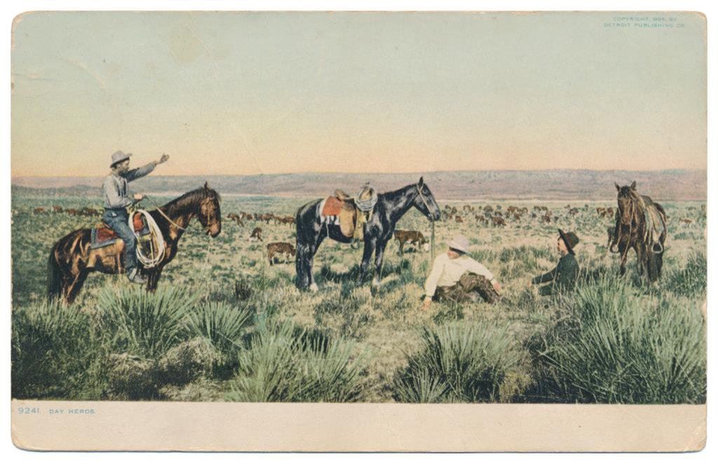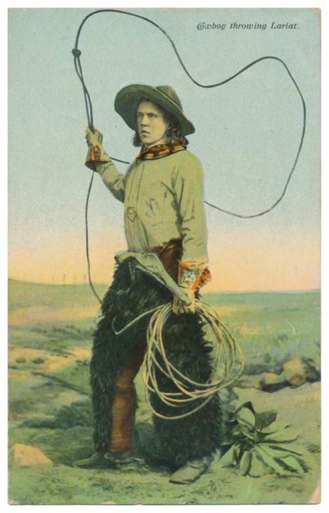 Bonanza lot of 31 postcards, photo postcards and photos of Western cowboys and Western-related themes including cattle round-ups, branding, steer roping, cattle drives and camp life; early postcards dated 1908, 1912, 1916; William S. Hart and his home (now a museum); a postcard of a cowboy with rope and holstered double action revolver marked “Claude Crow” on the back; a great tintype of a cowboy with rope and classic outfit; cards of identified cowboys in full outfits including chaps, etc. with names like “Blue Ribbon” Wilkins, Harry Jones and “Jay Bird” Miller. A collection in itself of mostly early West images of how cowboys lived and dressed. Est.: $175-$275.