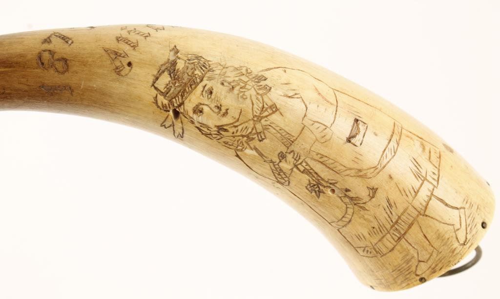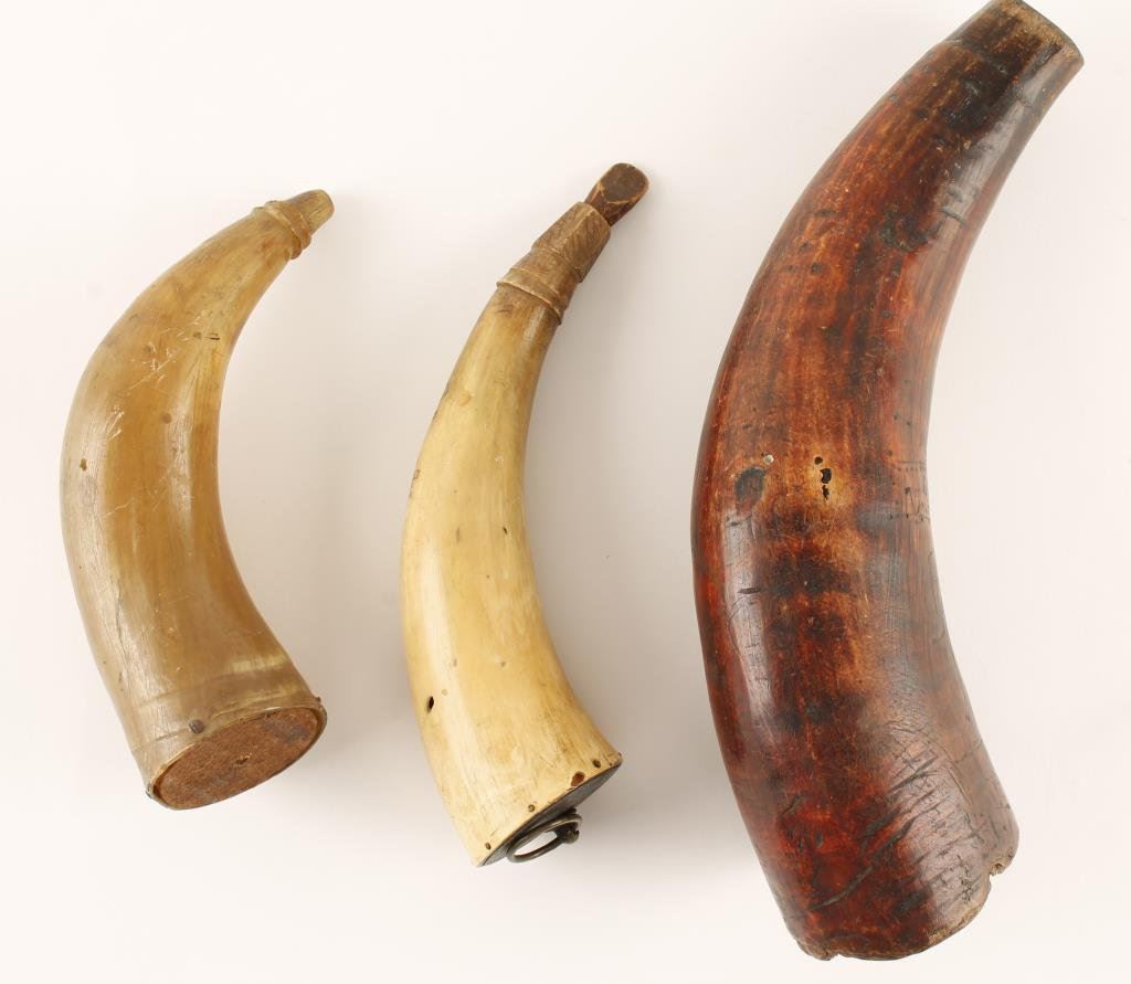 Lot of 3 misc. powder horns; one with scrimshaw carving of a lady and inscribed “1877/Alice”. Est.: $100-$200.