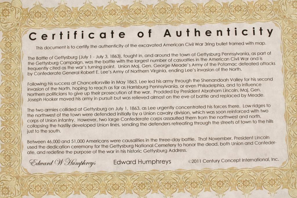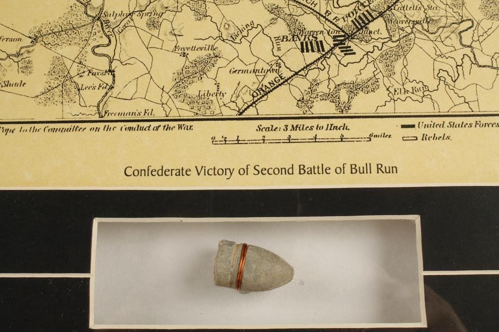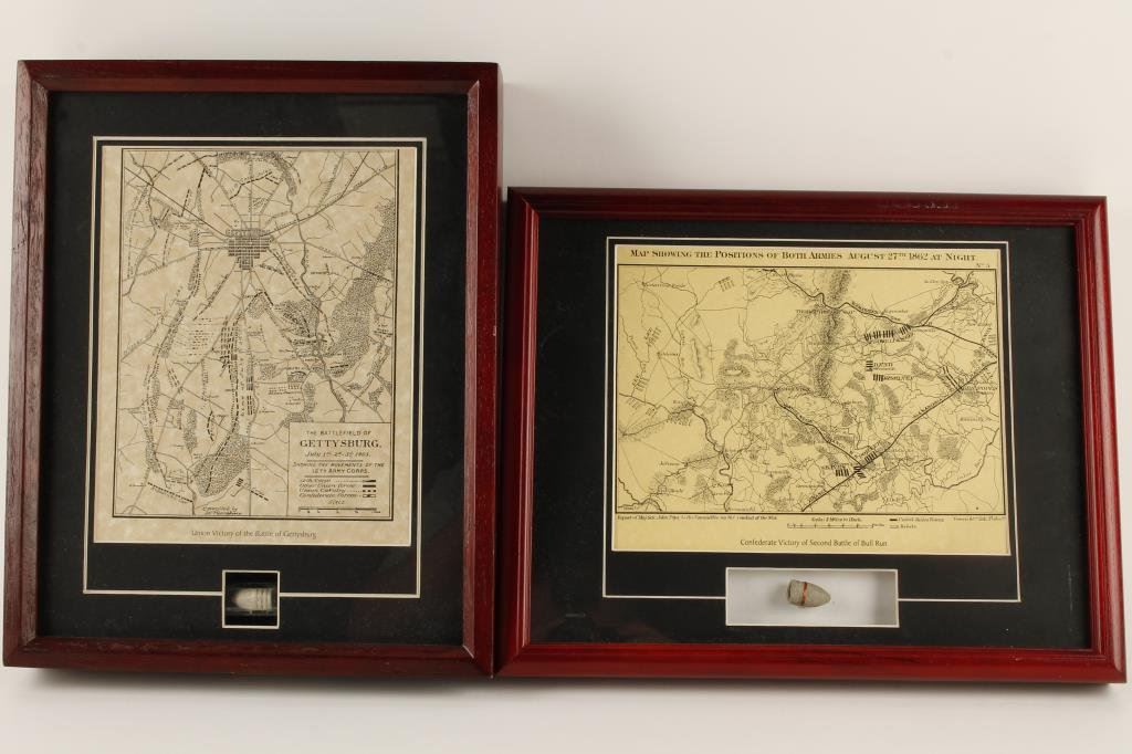 Lot of two framed and matted shadowbox displays of Civil War era lead bullets; one is a three ring variety displayed with a map of Gettysburg; the other is a two ring bullet with a map of the Battle of Second Bull Run. Est.: $100-$200.