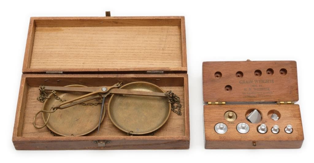 Old brass mining balance scale in wood box in overall good condition; box is approximately 7.5” x 3.5” x 1.5”; also included is a wood box of grain weights by H. N. Webster, box is approximately 4” x 2” x 1.5” and also in good condition. Est.: $125-$175.