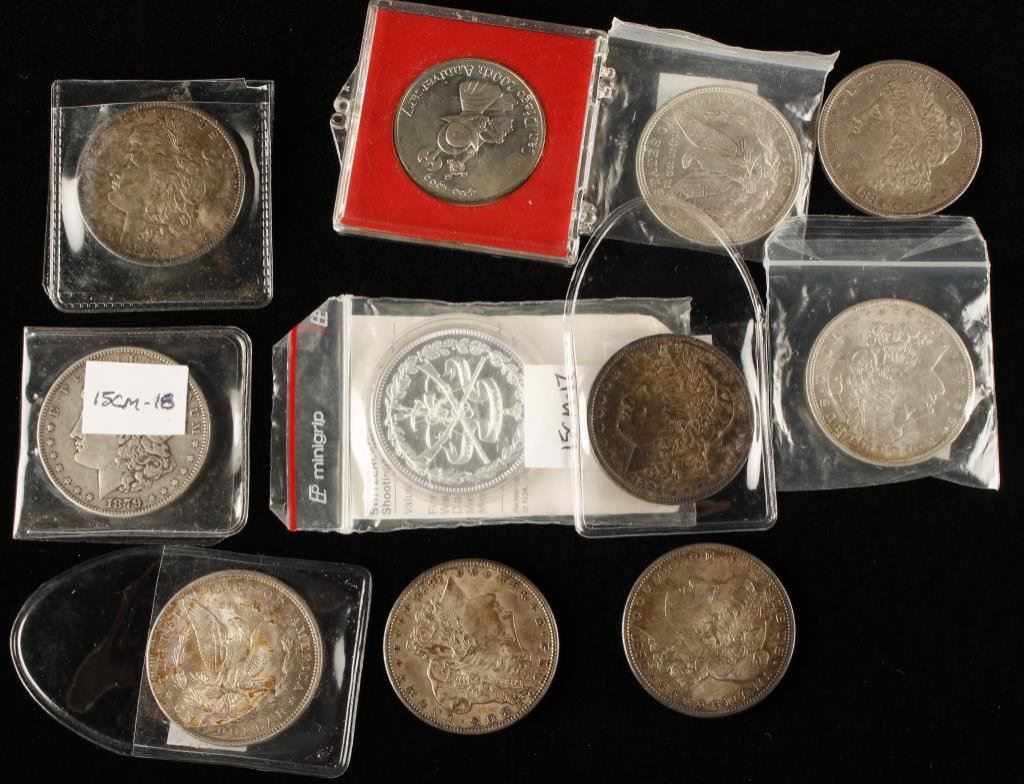 Lot 736 Lot of 9 ungraded Morgan Silver Dollars and 2 silver commemorative coins.