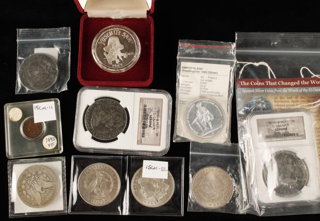 Lot of 5 ungraded Morgan Silver Dollars, an ungraded Indian Head penny, a commemorative Swiss silver coin, a troy oz 1987 Yosemite Sam commemorative coin and two silver 8 Reals, each in an NGC slab. The Morgans are dated 1885-S, 1886-S, 1880-S, 1921 and 1921-D; the Indian Head penny is dated 1893 and the 8 Reals are dated 1782 and 1783 and certified by NGC as from the shipwreck El Cazador (lost Jan. 1784). Est.: $250-$500.
