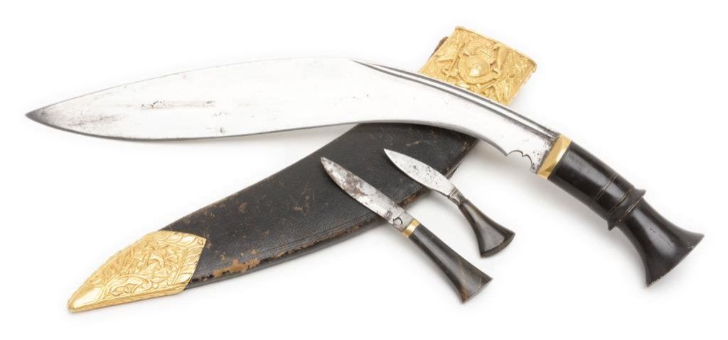 British style Gurkha with carved horn handle and leather scabbard with gold ornamentation. The knife is in overall very good condition with an overall length of 17”, a 13” blade and brass bolster. The blade shows sharpening and some light surface erosion. The carved horn grip shows small chips at the base of the handle but is otherwise in overall good condition. The scabbard is leather showing some losses with raised gold colored metal work at the mouth and toe of the sheath. 4” and 5” side knives, both with horn handles, complete the set. Est.: $200-$400.
