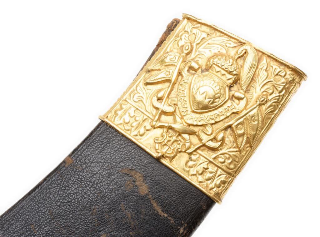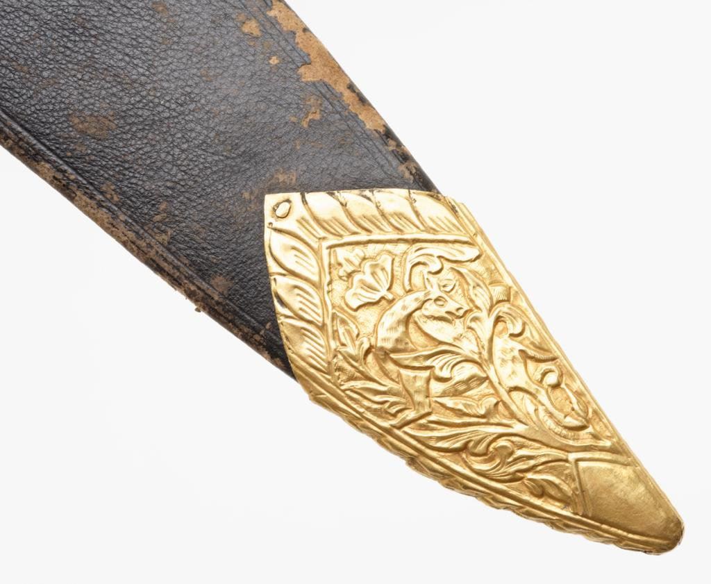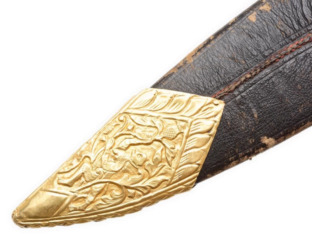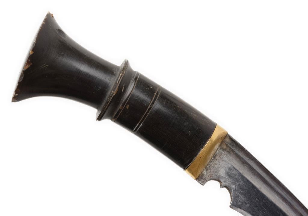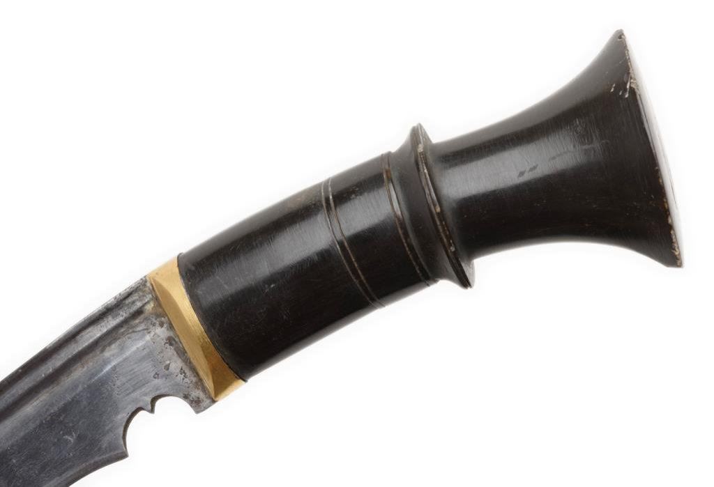 Lot 739 British style Gurkha with carved horn handle and leather scabbard with gol
