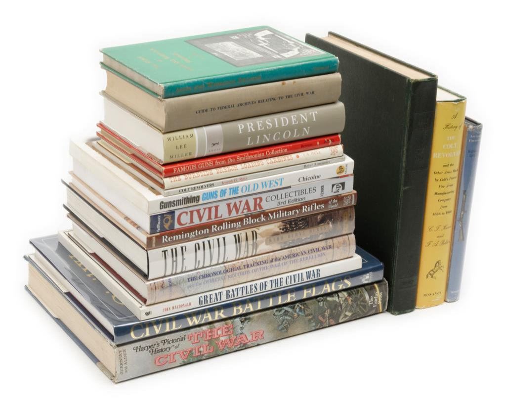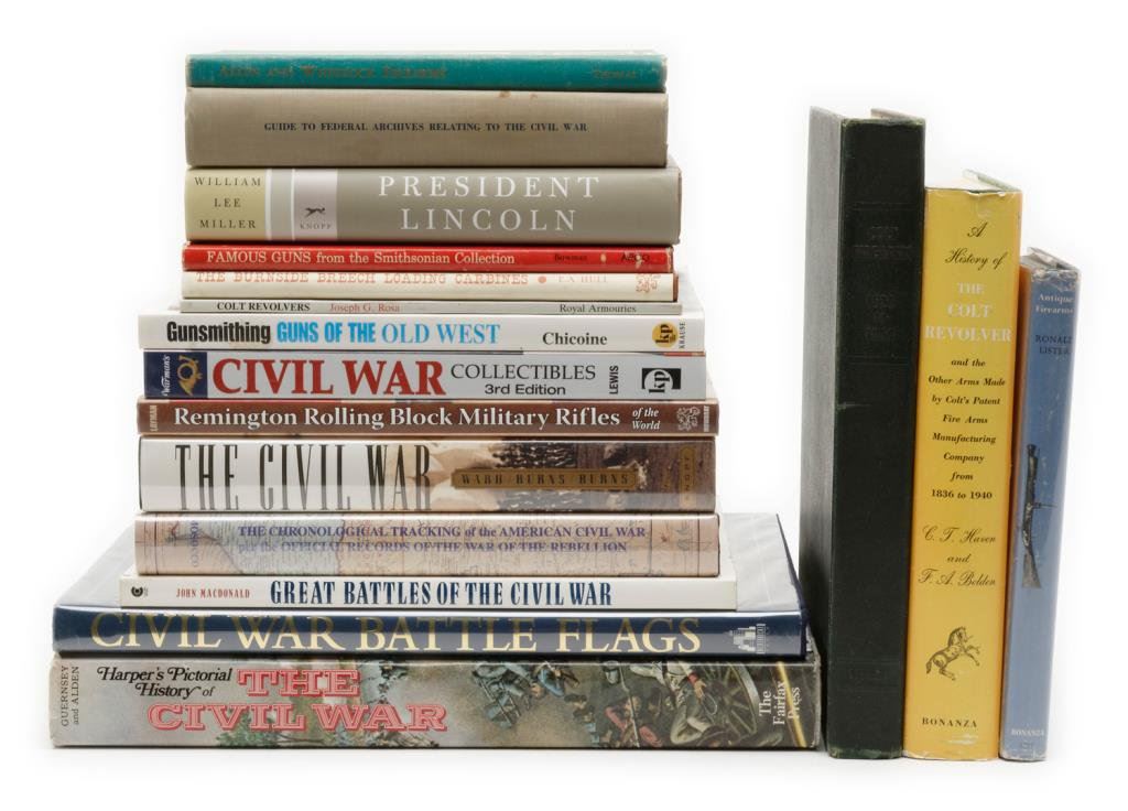 Bonanza lot of 17 hardback reference books including “Civil War Battle Flags” by Gen. C. McKeever; “Harper’s Pictorial History of the Civil War”; “A History of the Colt Revolver” by Haven and Belden; “Remington Rolling Block Military Rifles” by Layman; “Allen & Wheelock Firearms” by Thomas; “Gunsmithing Guns of the Old West” by Chicoine; “Civil War Collectibles” by Lewis; “The Burnside Breech Loading Carbines” by Ed Hull and many more Est.: $300-$600.