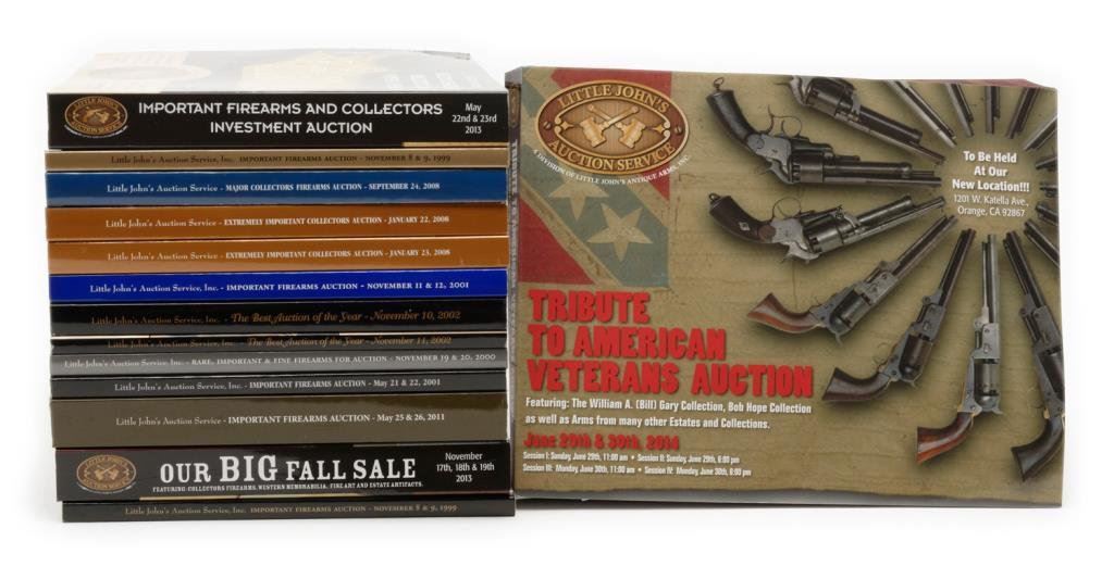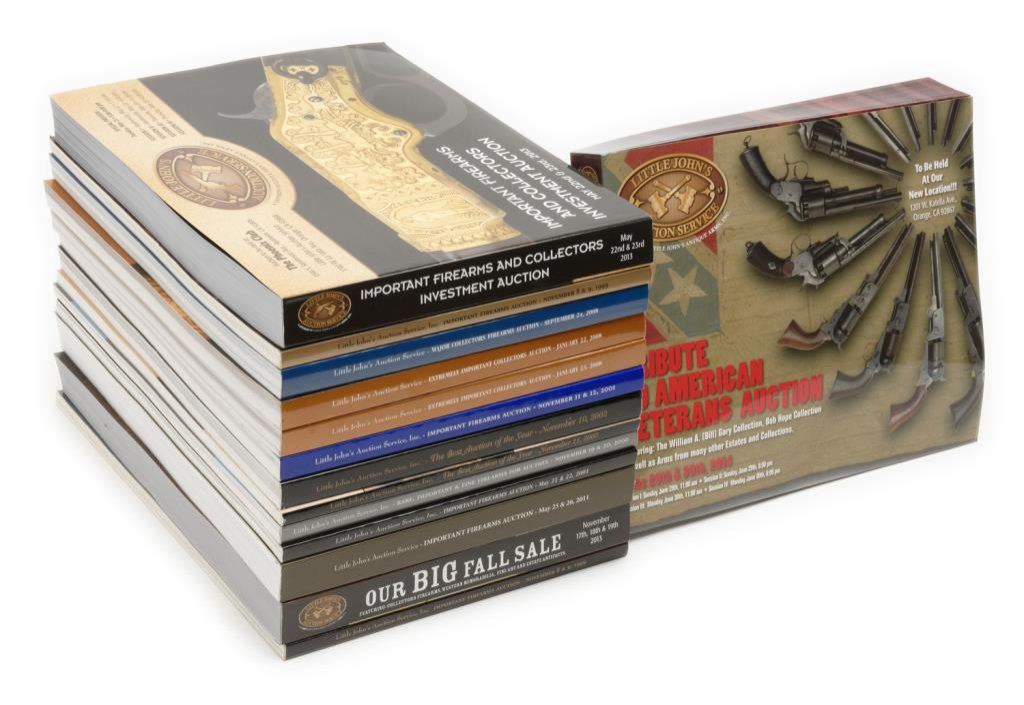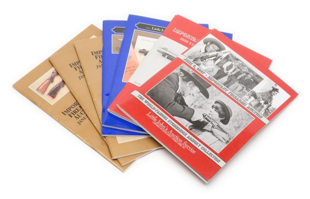Lot of 20 Little John’s auction past catalogs including scarce Nov. 2000 catalog with Gen. G.A. Custer’s Springfield Sporting rifle; scarce June 2007 Stembridge Armory collection of Movie guns; Nov. 2002 famous Dr. Joseph Murphy collection; scarce Jan. 2008 John S. duMont collection, excellent June 2014 catalog with famous Bill Gary Confederate arms collection and the Bob Hope collection plus many more. Great reference materials for any gunroom library! Est.: $200-$400.