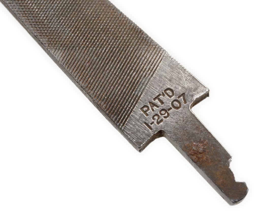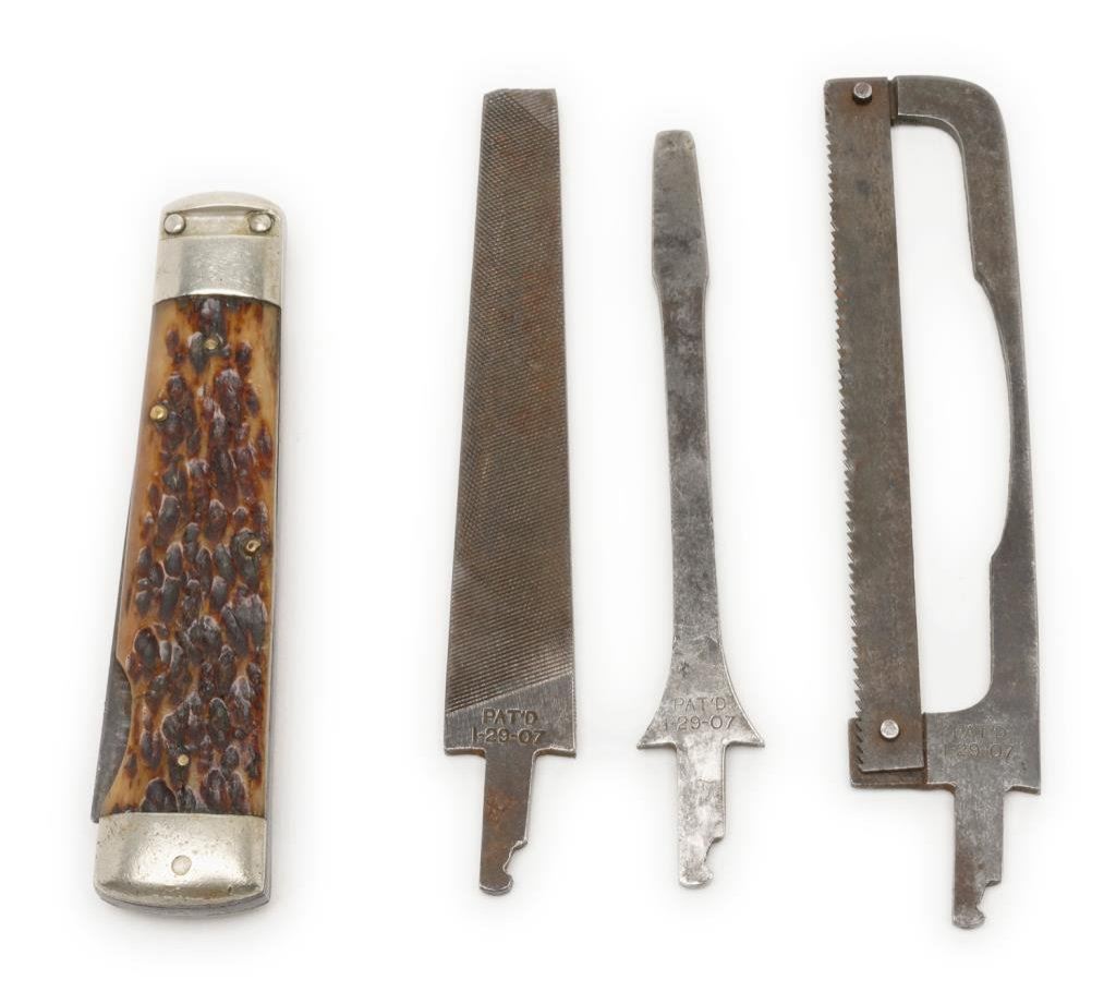 Unusual 3 tool pocket knife with patent date of 1-29-07; stag scales and each tool is patent marked and removable. The tools include a file, a blade screwdriver and a hacksaw; overall very good condition. Est.: $150-$300.