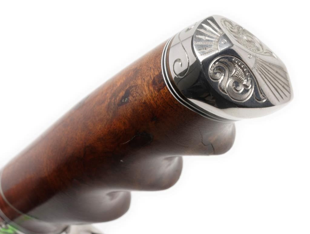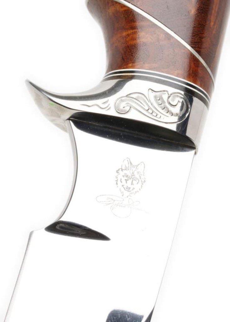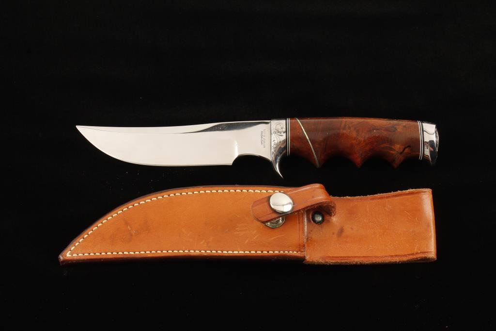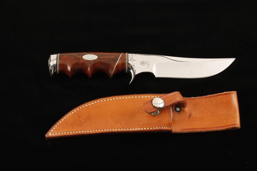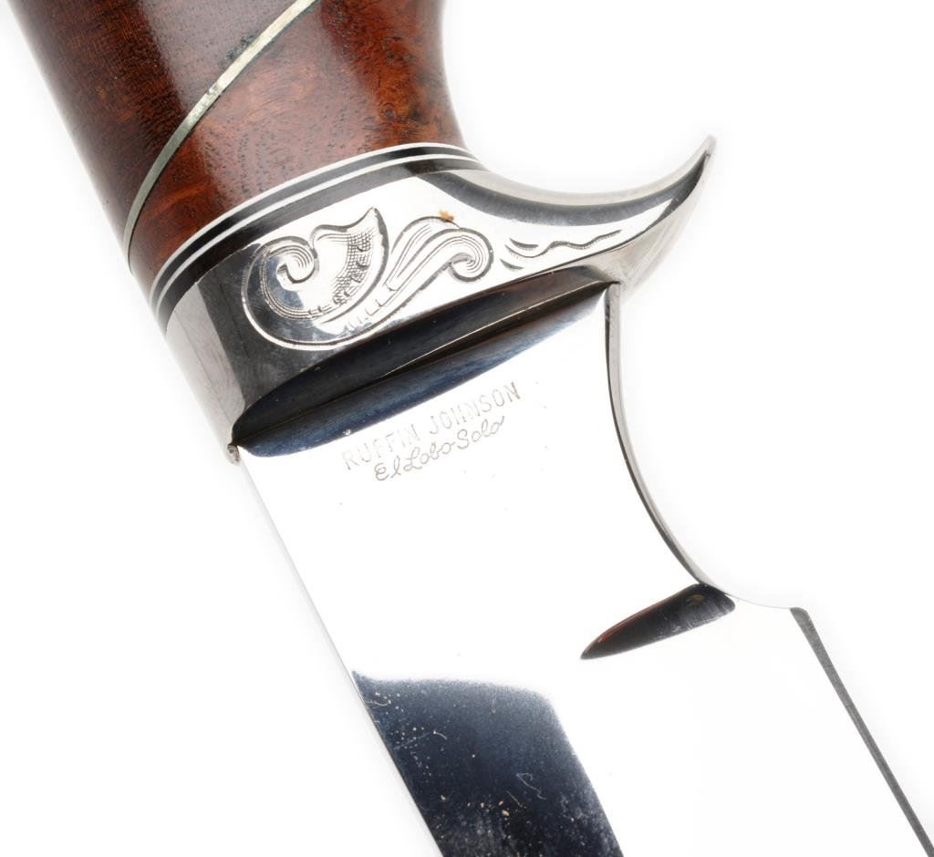 Custom knife and leather sheath by Ruffin Johnson (“El Lobo Solo”); knife is approximately 10” overall with a 5.25” blade, custom finger groove hardwood grip and engraved mounts; like new condition. Est.: $175-$350.