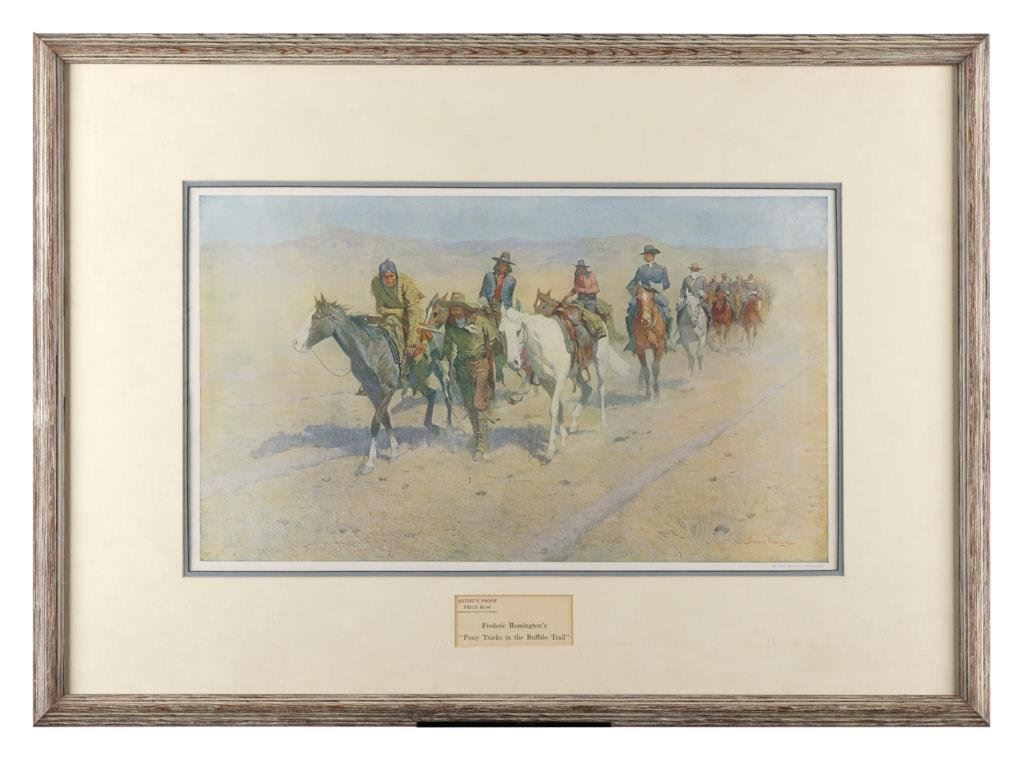 Framed and beautifully double matted early Frederic Remington (1861-1909) Artist’s proof color print entitled “Pony Tracks in the Buffalo Trail”, approximately 21” x 29” overall. Est.: $200-$400.