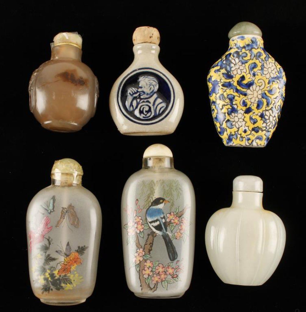Lot of 6 snuff bottles: a blue and yellow porcelain jade top; a Peking glass inside painted; a German Porchi-Prise (Bayern); another Peking glass with bird scene; a white jade and a carved agate piece. Est.: $300-$600.
